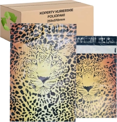 Practical and durable courier poly mailers measuring 255 × 370 mm with a bold cheetah pattern and a self-adhesive strip for quick sealing. Ideal for e-shops and secure packaging of shipments – the material is lightweight, water-resistant, and tear-resistant, protecting contents during transit. The pack contains 50 pcs.