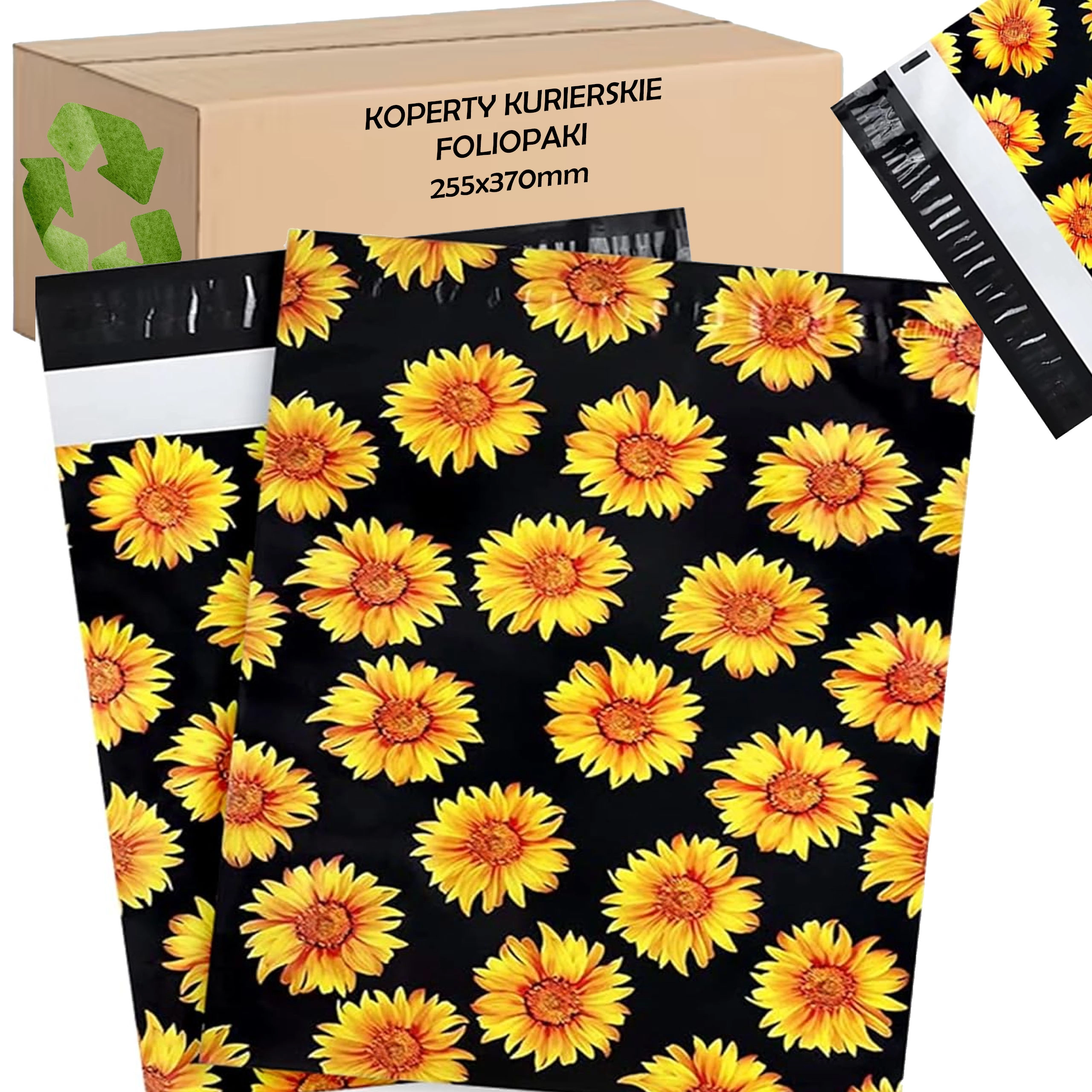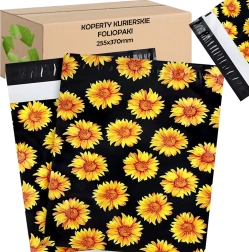 Practical and stylish courier poly mailers in size 255 × 370 mm with a sunflower design on a black background. Lightweight, durable, and water-resistant envelopes with a self-adhesive strip ensure fast packing and secure delivery of your shipments. The pack contains 50 pieces.