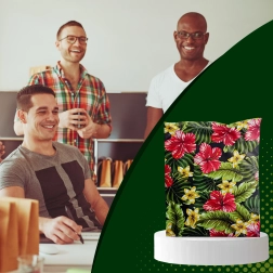 - Tropical floral motif (hibiscus, plumeria, green leaves) on a black background