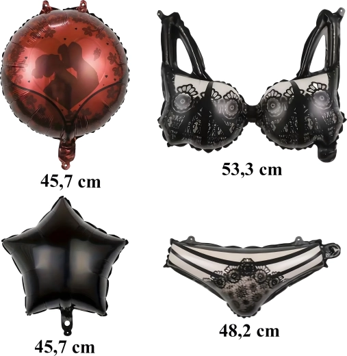 A fun hen party balloon set with a lingerie theme will light up any party. Includes a bra-shaped balloon (53.3 cm), panties-shaped balloon (48.2 cm), 2 round balloons and 2 printed balloons. Ideal as a photo booth decoration and for a Bride‑to‑Be party.