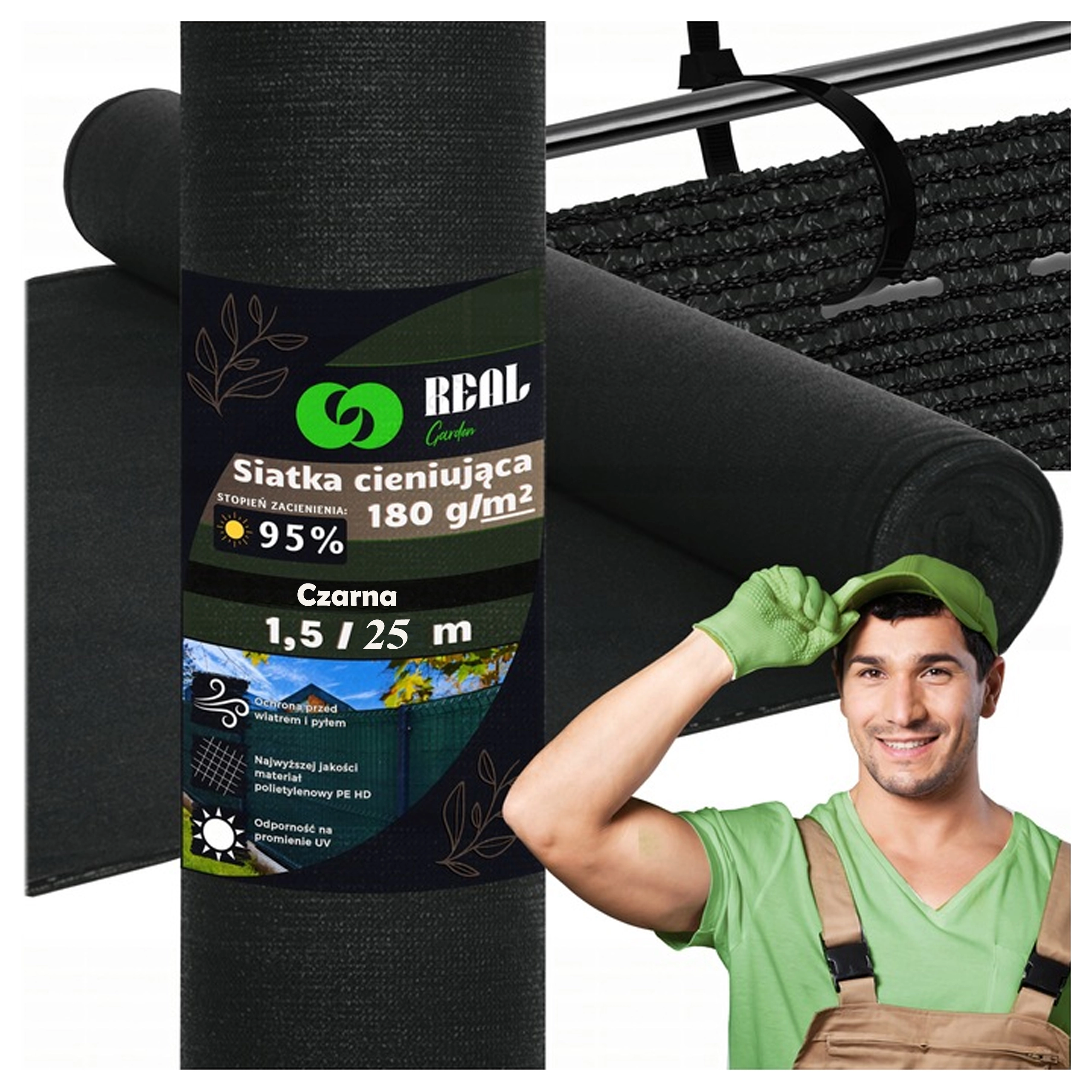 The roll measuring 1.5 × 25 m with a basis weight of 180 g/m² is equipped with mounting eyelets along the entire top and bottom edges for easy and secure fastening. Reinforcement around the eyelets increases strength and extends service life in everyday use.