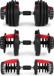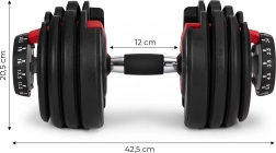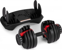 Save space and time with a dumbbell that replaces an entire rack of fixed weights. Thanks to the integrated dial weight selection system, you can smoothly switch between sets and exercises—from light warm-ups to demanding strength sets. Cast iron plates and durable plastic parts ensure long service life, while the base enables safe, intuitive load adjustments.