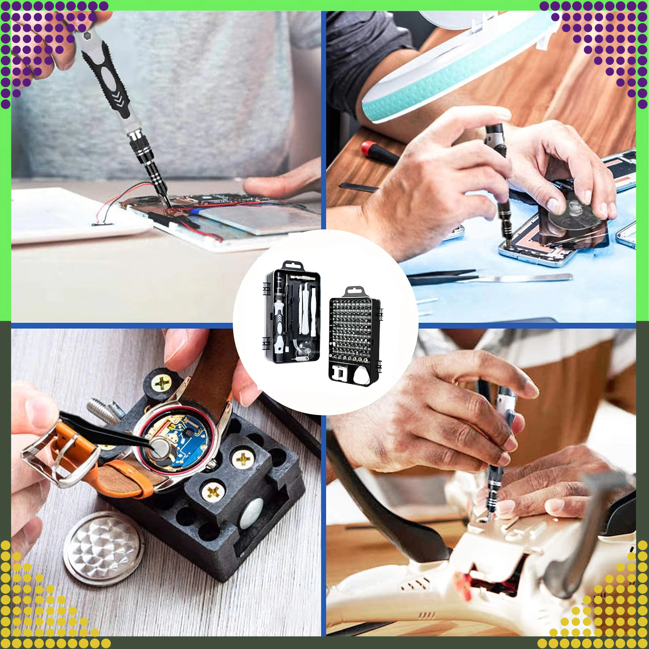 Inside you'll find 100 magnetic bits with longer shafts for better reach, a handle with extensions, tweezers, a suction cup, pry tools and triangular openers, plus a magnetizer/demagnetizer. The set is ideal for repairing phones, laptops, PCs, watches, glasses, cameras, and small models.