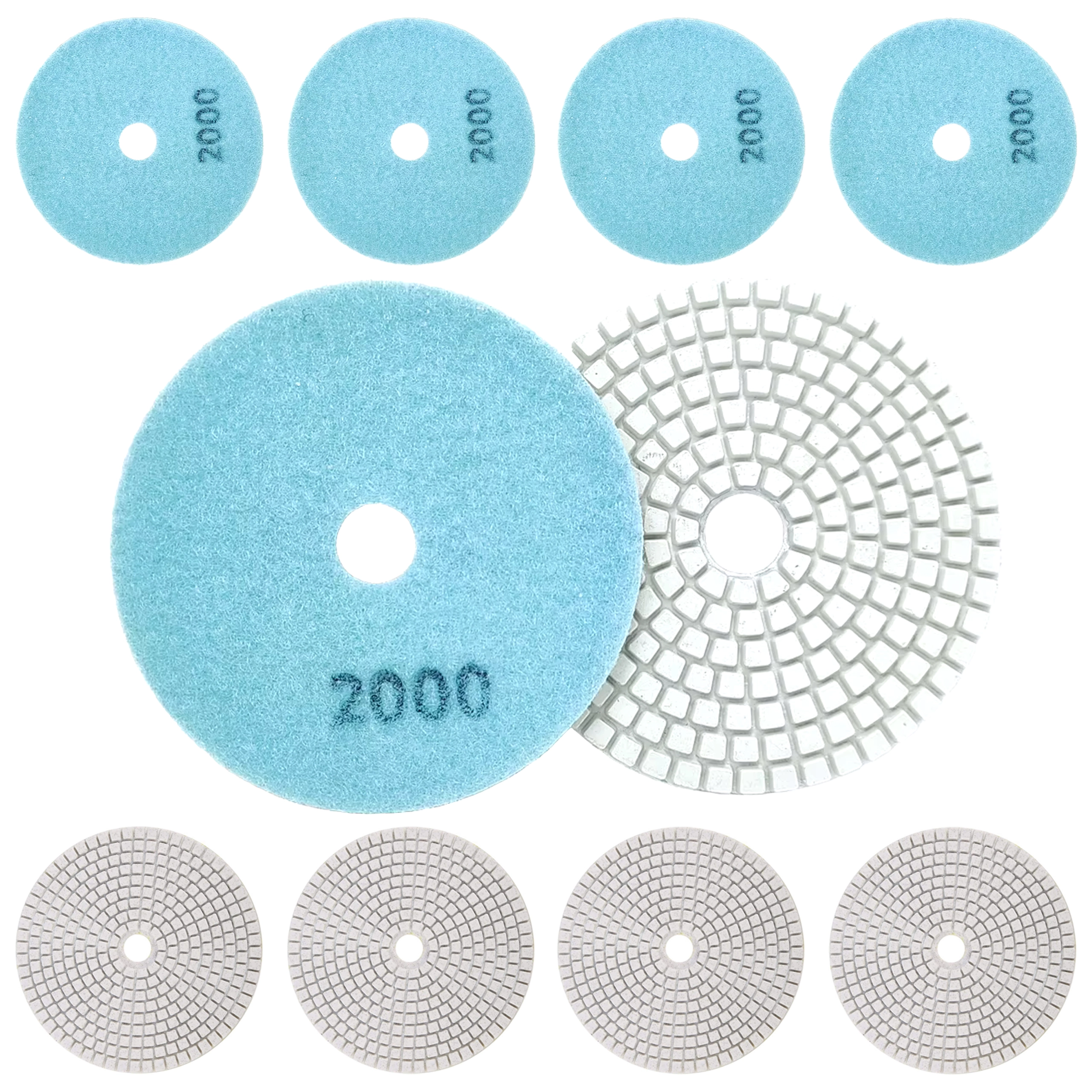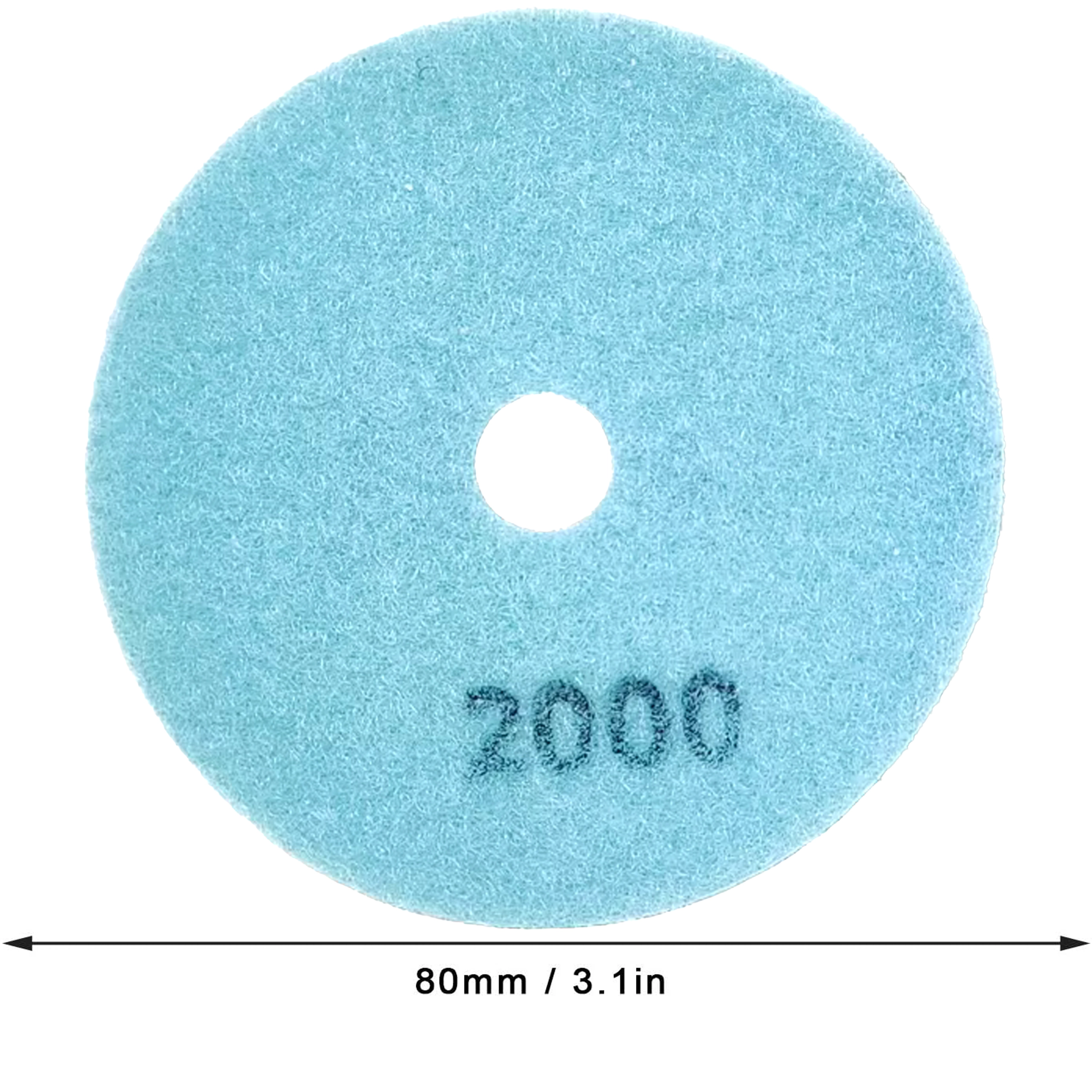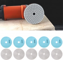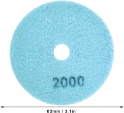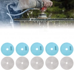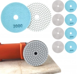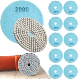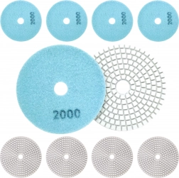 Professional set of 10 diamond polishing pads with 80 mm diameter for precise grinding and polishing of porcelain stoneware, ceramic, stone, marble, and granite. The pads allow both dry and wet work, and thanks to the hook-and-loop attachment they can be changed quickly and easily. Grit 2000 for fine finishing with a high-gloss result.