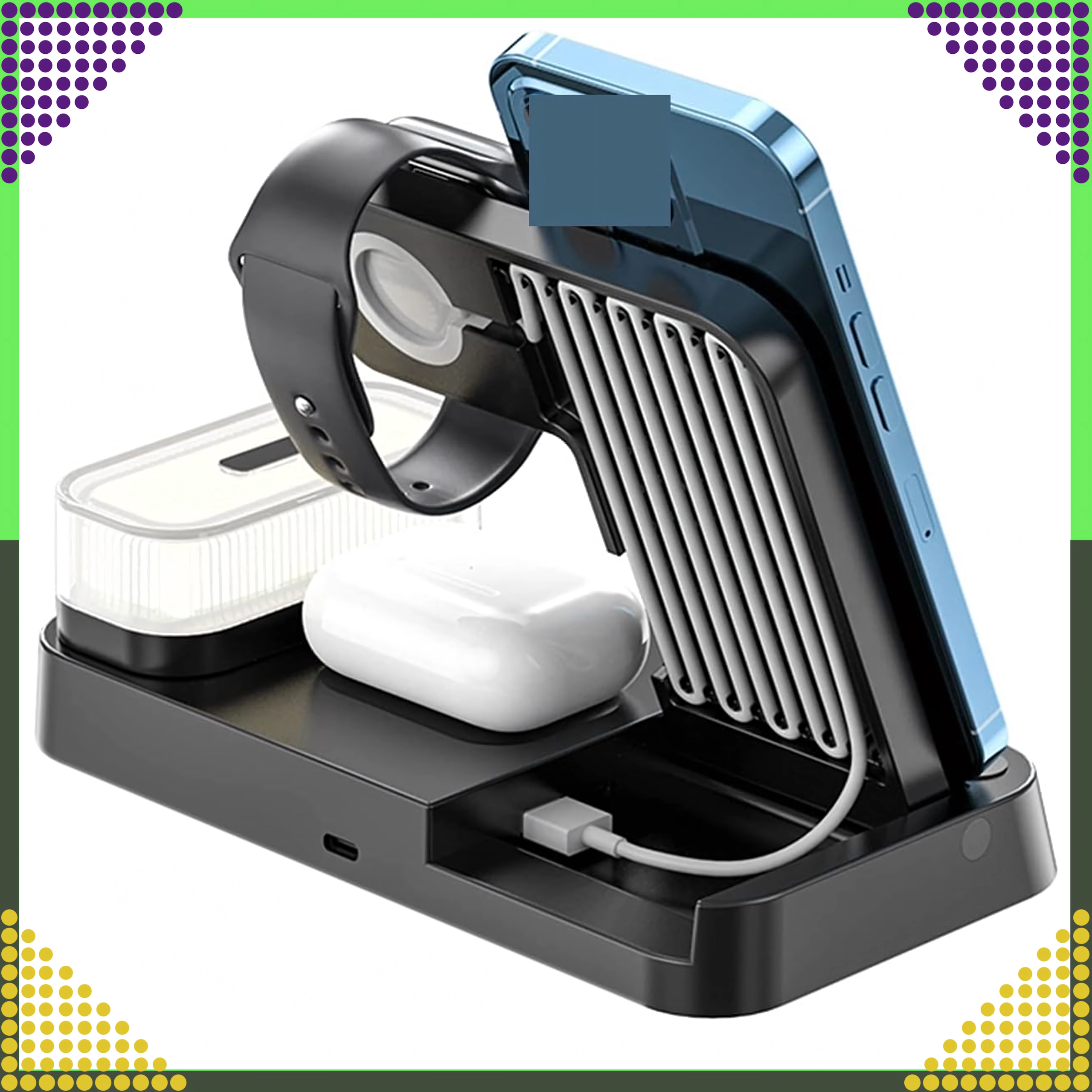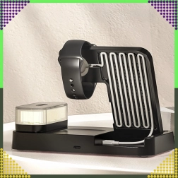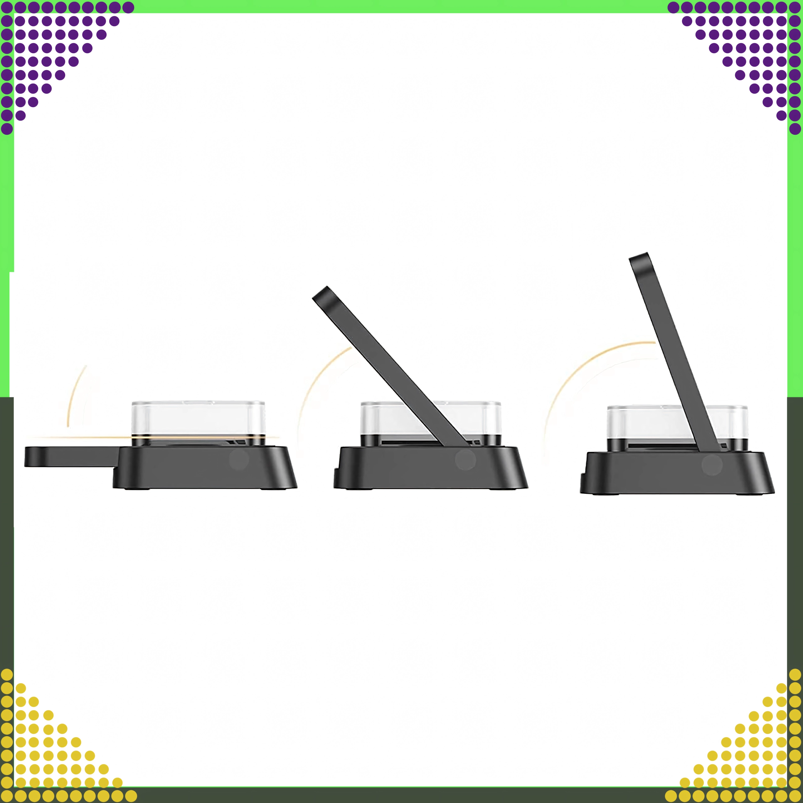 - Foldable, phone stand, raised module for watch, separate pad for earbuds