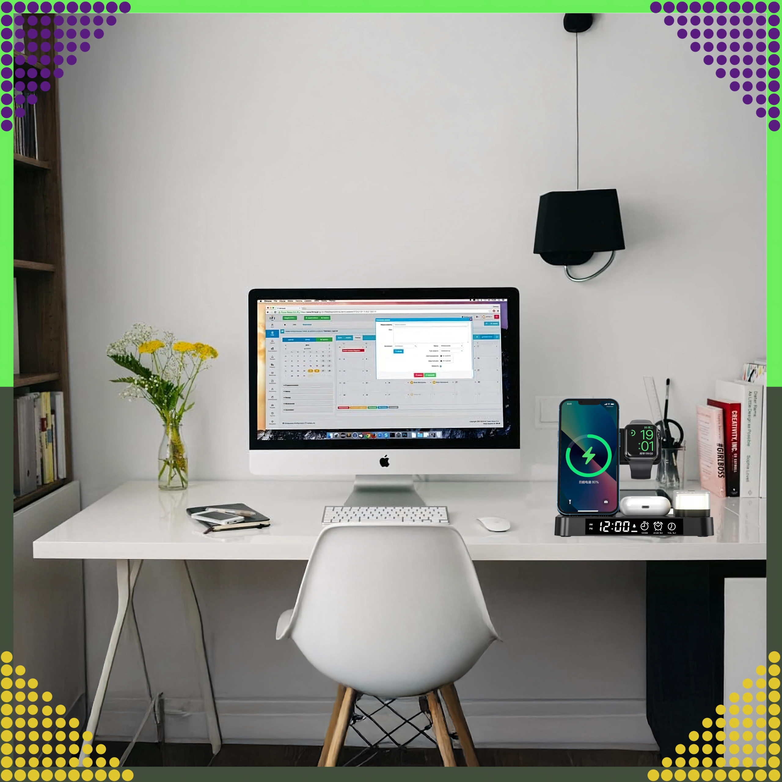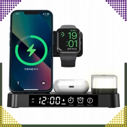 The universal 4-in-1 wireless station combines 15 W fast charging, a phone stand, charging for Apple Watch and AirPods, plus LED clock with night light. The elegant foldable design saves space and is compatible with all devices that support Qi.