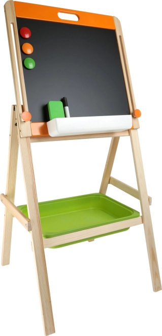The stable wooden frame with spacer pads ensures wobble-free writing, and the practical green storage box keeps chalk, markers, and magnets always at hand. The board supports active play, development of motor skills, imagination, and foundations of literacy and numeracy.