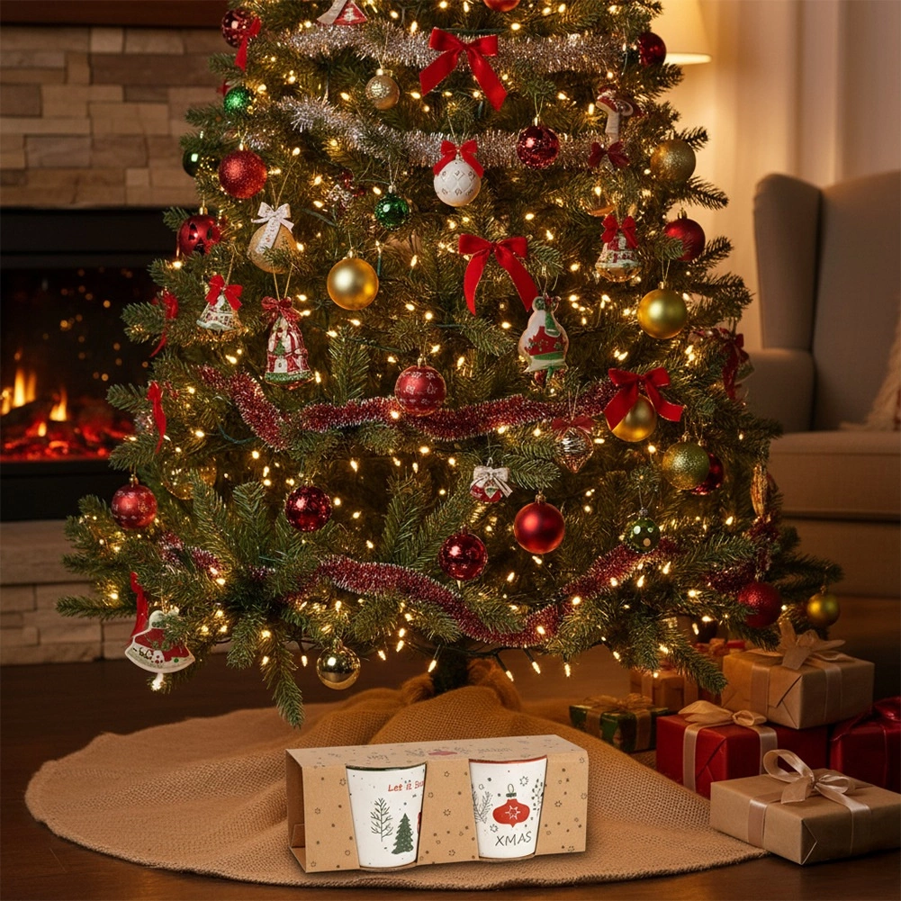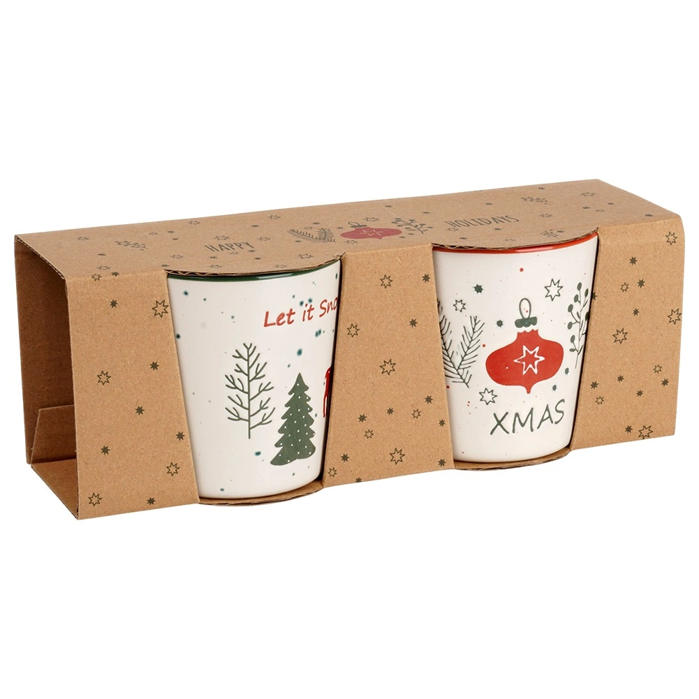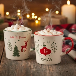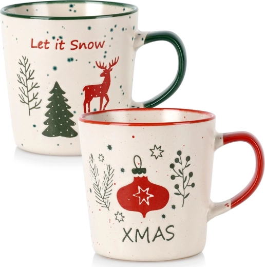 A stylish set of two 350 ml Christmas mugs brings true festive spirit to your everyday tea, coffee, or cocoa. The beige mugs with the inscriptions LET IT SNOW and XMAS feature color-coordinated rims and handles (green and red), are comfortable to hold, and keep drinks warm beautifully. Made from durable stoneware, they are dishwasher and microwave safe, and come in gift packaging – ideal as a Christmas present.