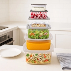 Keep your kitchen tidy with this versatile set of food containers. Volumes from 275 ml to 3.2 l cover everything from snacks and salads to pasta or baking ingredients. Clear walls allow quick content checks without opening, and snug-fitting lids ensure reliable leak resistance for storage and transport.