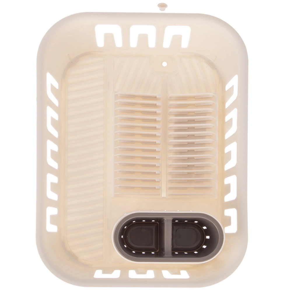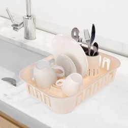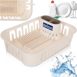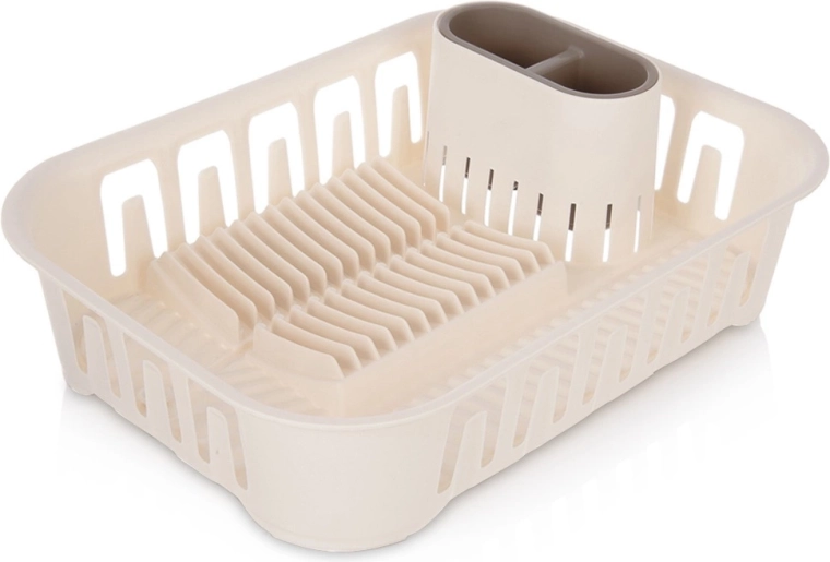 Practical cream-colored dish drying rack with a removable cutlery holder13 plates. It features a drainage system with a closable spout, a stable non-slip base, and is easy to clean – ideal for the kitchen, cottage, or caravan.