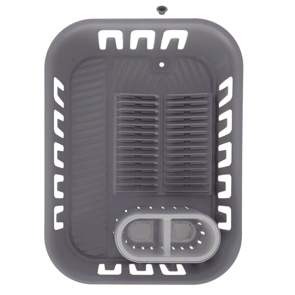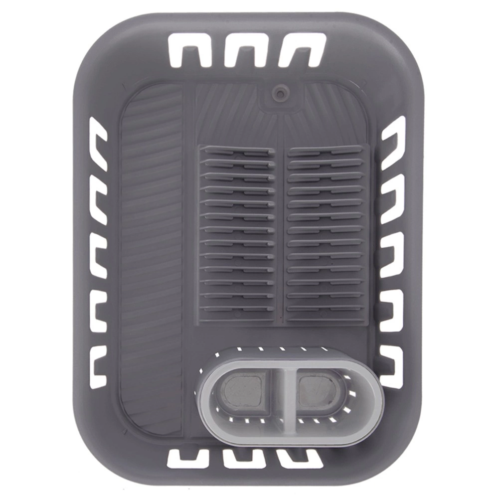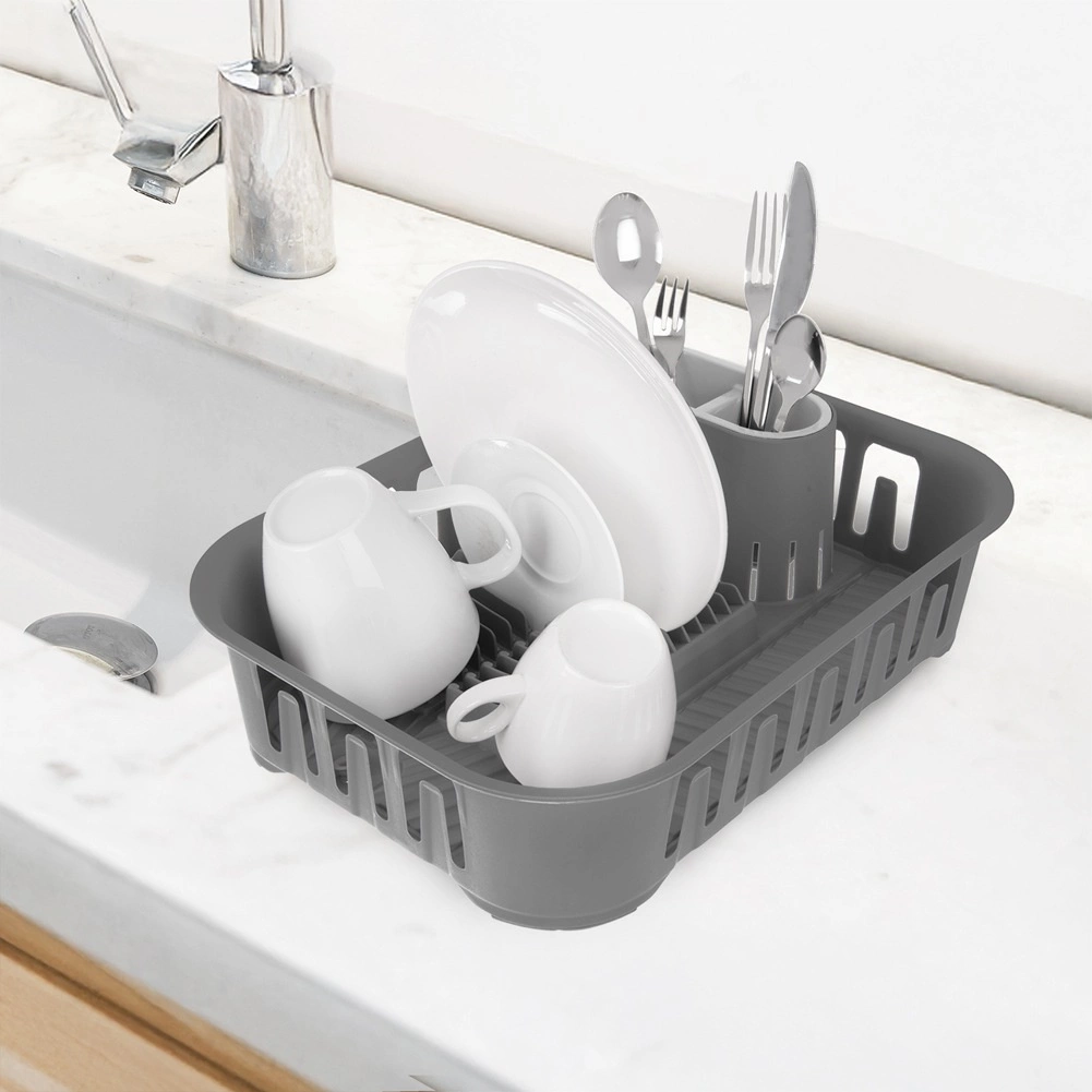 A handy dish drainer in an elegant grey color makes drying washed plates, mugs, and cutlery easy while protecting your kitchen countertop from water. It has a well-designed base with an integrated drain and stopper, so you don’t need an extra tray. It includes a removable two-compartment cutlery box for convenient sorting.