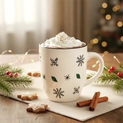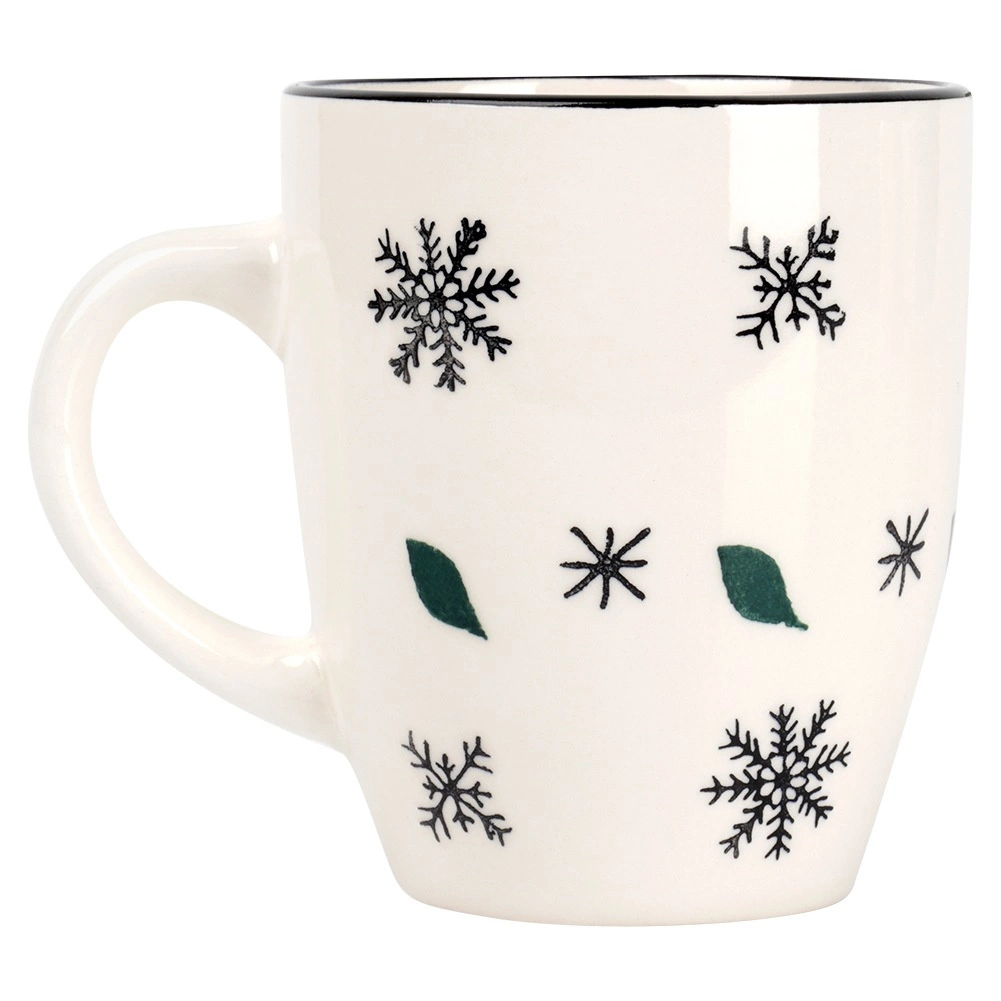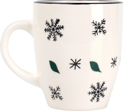 Get cozy with a ceramic mug that turns every sip into a pleasant winter ritual. The white surface is decorated with black snowflakes and subtle green accents, highlighted by a thin black rim for an elegant look. The mug has a versatile shape, feels comfortable in hand, and fits seamlessly into your daily routine.