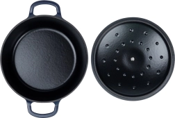 - Design: dark blue exterior, black enamel interior — a practical and elegant cooking companion.