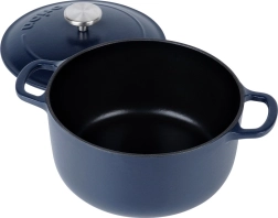 This LITINA cast-iron pot with a 22 cm diameter combines a traditional material with a modern finish. Heavy cast iron conducts and retains heat excellently, while the smooth enamelled interior minimizes sticking and simplifies maintenance. The dark blue exterior glaze adds style to your kitchen, and the pot can go straight to the table — the cast iron keeps food warm for a long time.