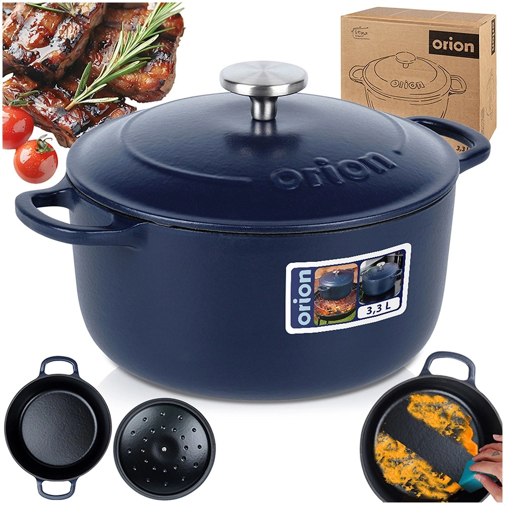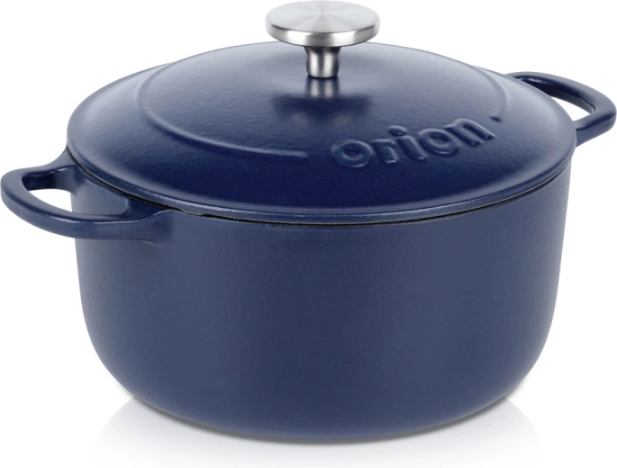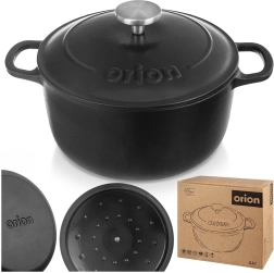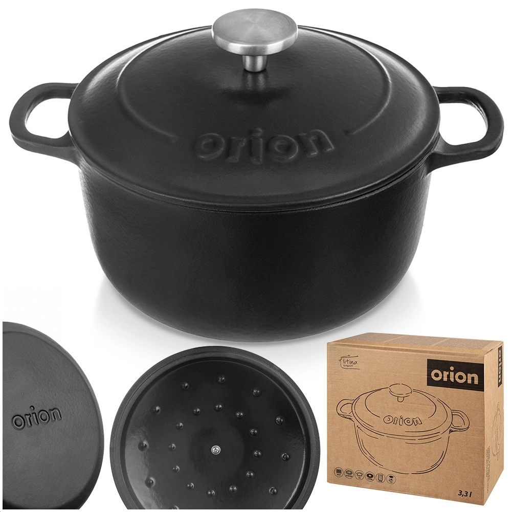 Universal cast-iron pot with lid, 3.3 l, for everyday cooking and slow braising. Thanks to its even heat distribution, long heat retention, and resistance up to 250 °C, it’s ideal for soups, stews, goulash, and roasted meats. The interior enamelled surface makes cooking, serving, and cleaning easier, while the robust side handles and stainless-steel knob on the lid ensure safe handling. Proven quality by ORION.