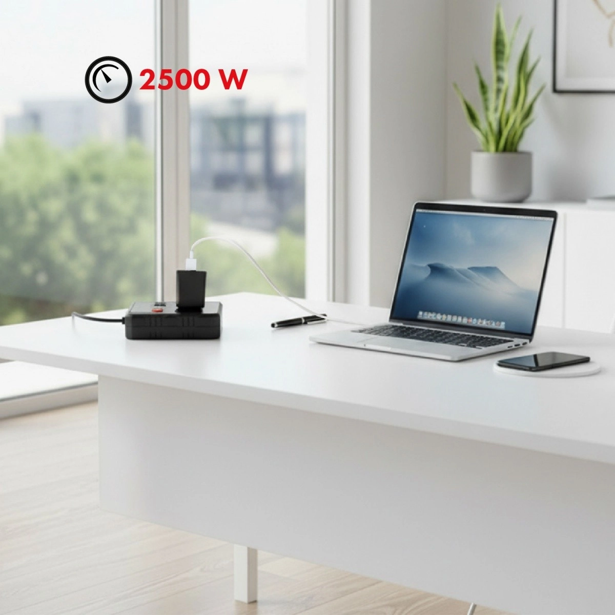 A compact power strip with 2 outlets and 3 USB ports is ideal for the office, living room, and bedroom. It offers up to 2500 W, safe power delivery, and saves space. Thanks to its modern design and practical build, it helps keep your desk and home tidy.