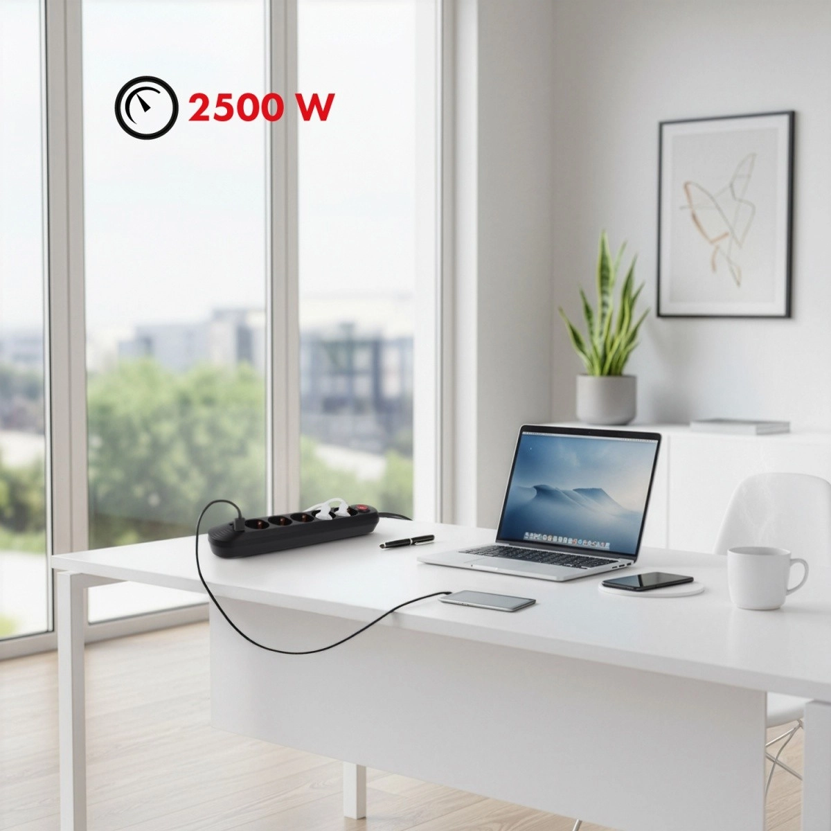 This compact and durable power strip combines classic outlets with built-in USB charging, saving both space and adapters. A wide input voltage range of 110–240 V AC (50/60 Hz) ensures reliable operation in various conditions, and the maximum load of 2500 W covers most everyday appliances.