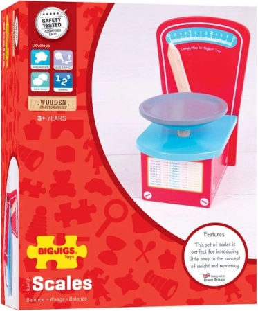 This fully wooden, functional scale from Bigjigs Toys is an ideal addition to any play kitchen. While role-playing cooking, children practice counting, estimating weight, and social skills during cooperative play.