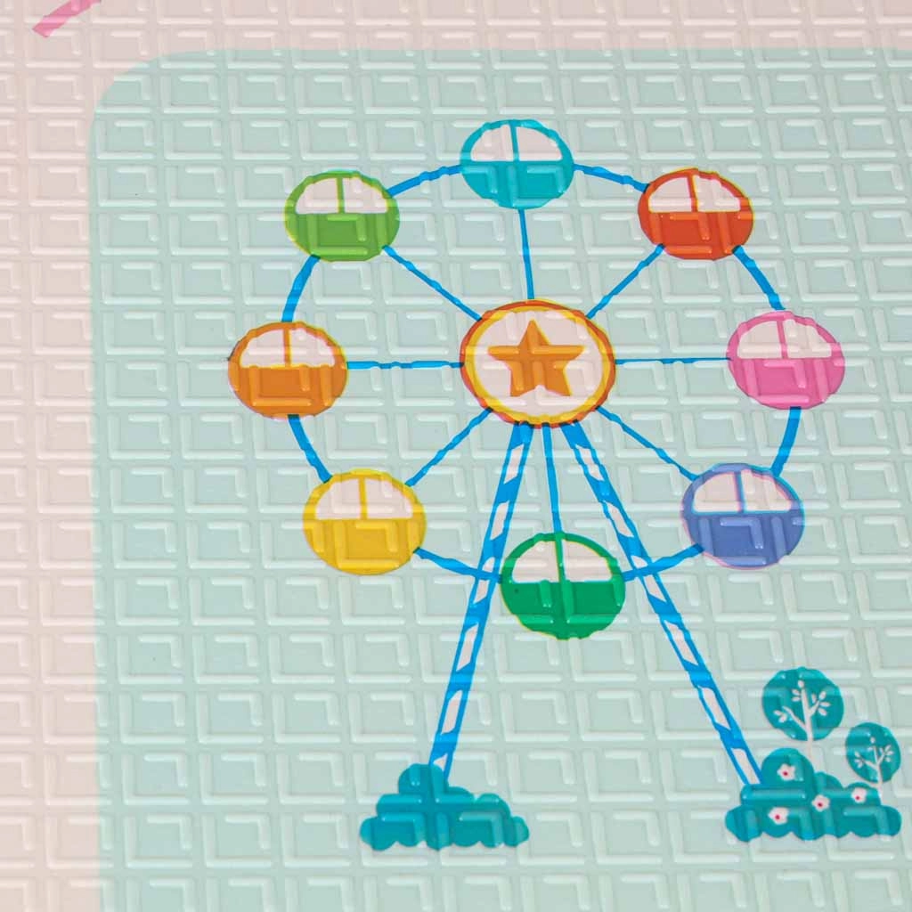 Cute pandas on one side and a road motif on the other foster imagination, learning, and fun with toy cars and building blocks.