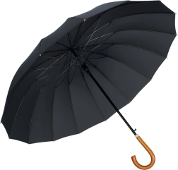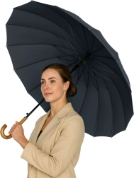An elegant and exceptionally durable long umbrella with 24 reinforced ribs combines classic style, high wind stability, and the convenience of automatic opening. The large 115 cm canopy reliably protects one or two people, the water-resistant, quick-drying fabric makes maintenance easy, and the curved wooden handle adds a timeless look. Includes a shoulder-strap sleeve for comfortable carrying.