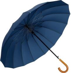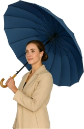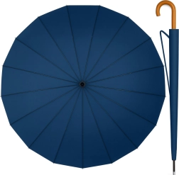 An elegant and durable long umbrella with 24 reinforced ribs offers exceptional stability even in wind. It features a large 115 cm canopy, automatic opening for quick use, water-resistant and quick-drying fabric, and a wooden J handle for comfortable carrying. Includes a shoulder-strap sleeve.