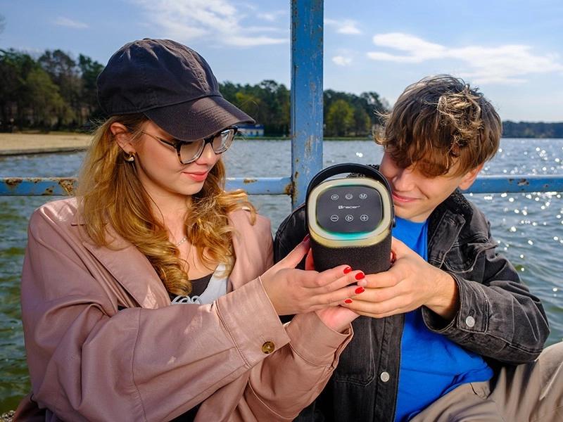 With TWS (True Wireless Stereo), you can link two speakers into a true stereo system. Listening is further enhanced by FM radio and AUX, USB, and microSD inputs, so you can play music even without a phone. IPX5 shielding protects against rain and splashes, while the practical strap and RGB lighting add style and convenience on the go.