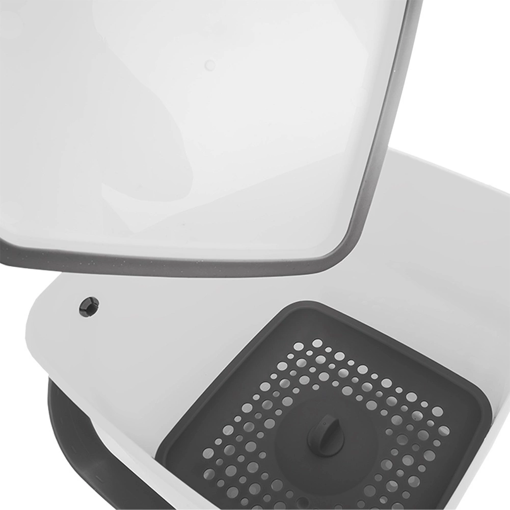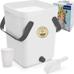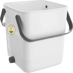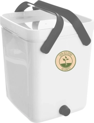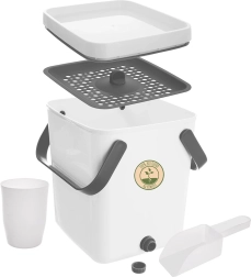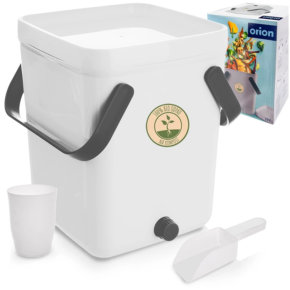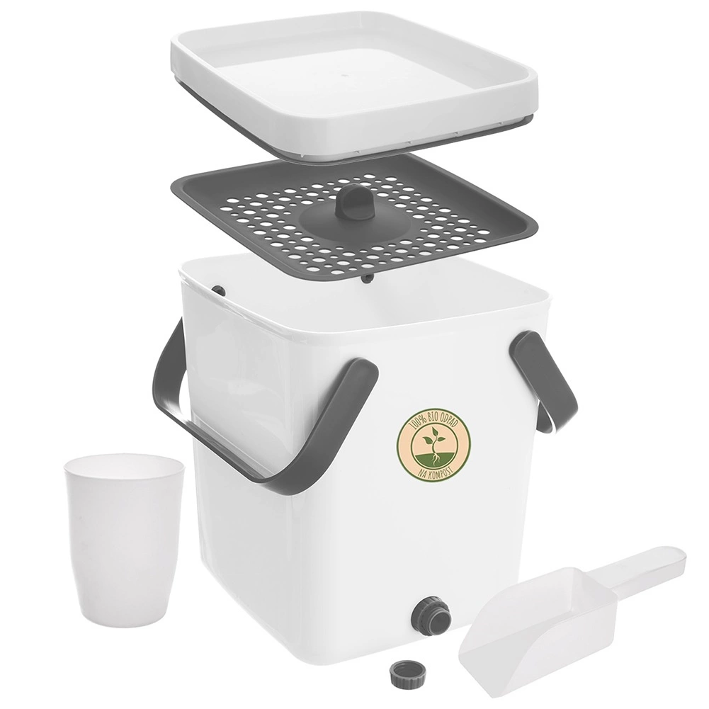The tight lid with quality sealing ensures clean and safe use in the kitchen. The composter is made of durable plastic (white body, gray handles) and has foldable handles for easy carrying. The set includes a sieve to separate liquid, a measuring cup, and a scoop.