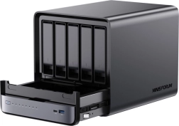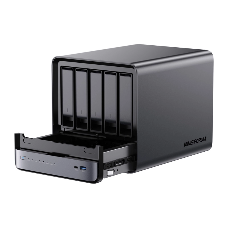 The compact MINISFORUM NAS N5 combines the power of a mini PC with the flexibility of a NAS. It offers a 8-core AMD Ryzen 7 with Radeon 780M graphics, up to 96 GB DDR5, space for up to 8 drives with a capacity of up to 144 TB, fast networking 10 GbE + 5 GbE, modern connectivity USB4 and HDMI 2.1, plus expansion via PCIe x16 and OCuLink. The MinisCloud OS ensures easy management, ZFS snapshots, and secure remote access.