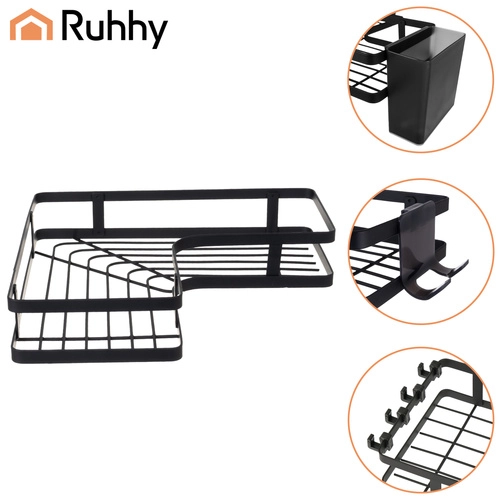 A practical set of two RUHHY corner bathroom shelves offering no-drill installation, a durable steel construction, and a modern loft design. Ideal for the shower or above the bathtub – holds up to 3 kg per shelf, drains water, and keeps cosmetics and accessories tidy. Includes hooks and holders for toothbrushes/toothpaste for perfect organization.