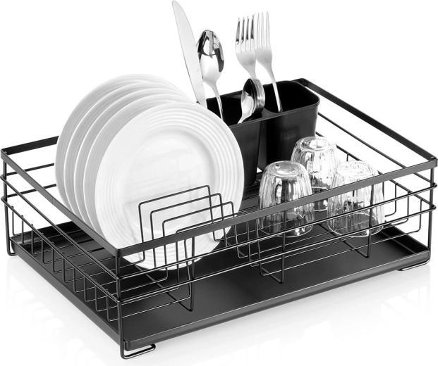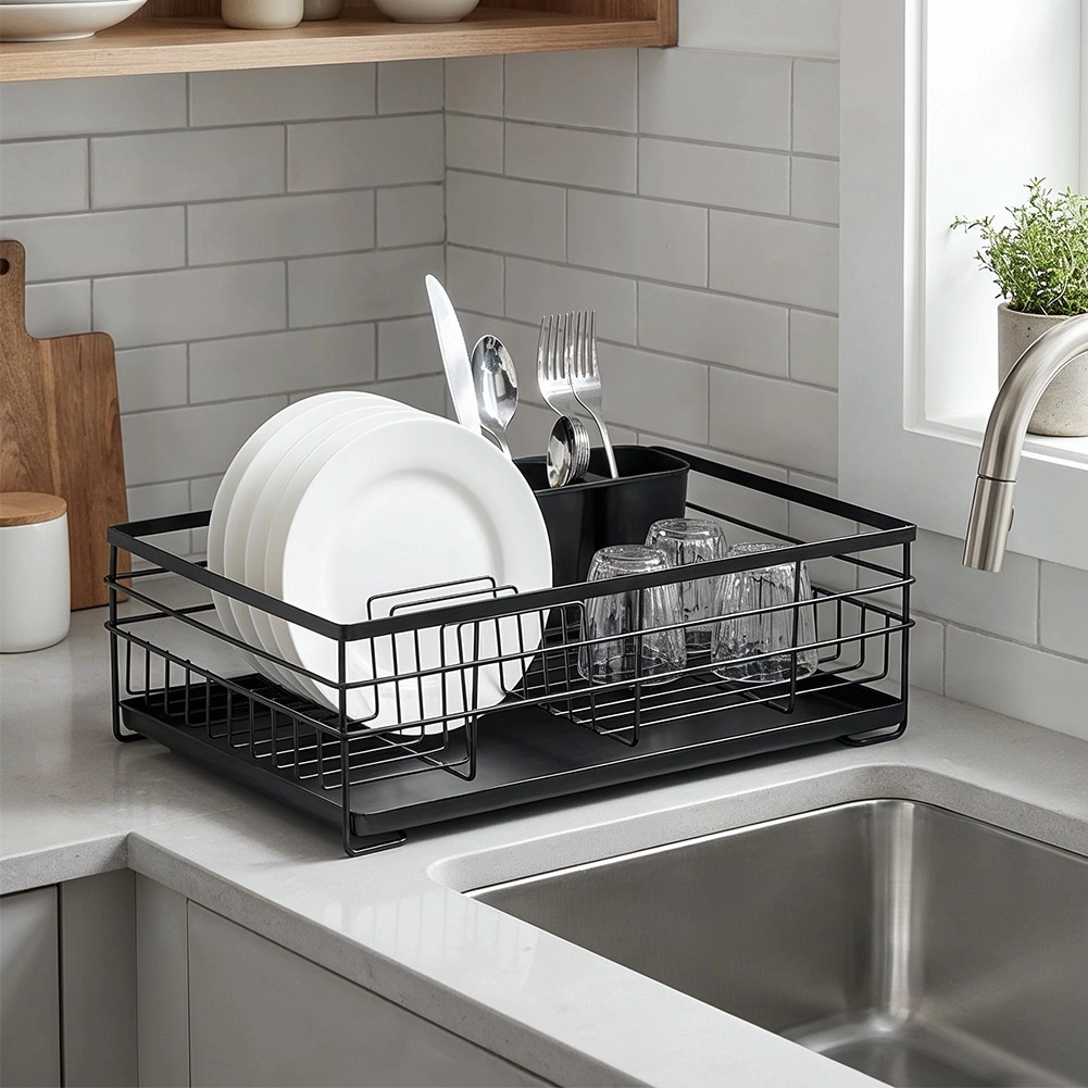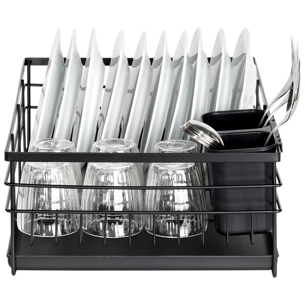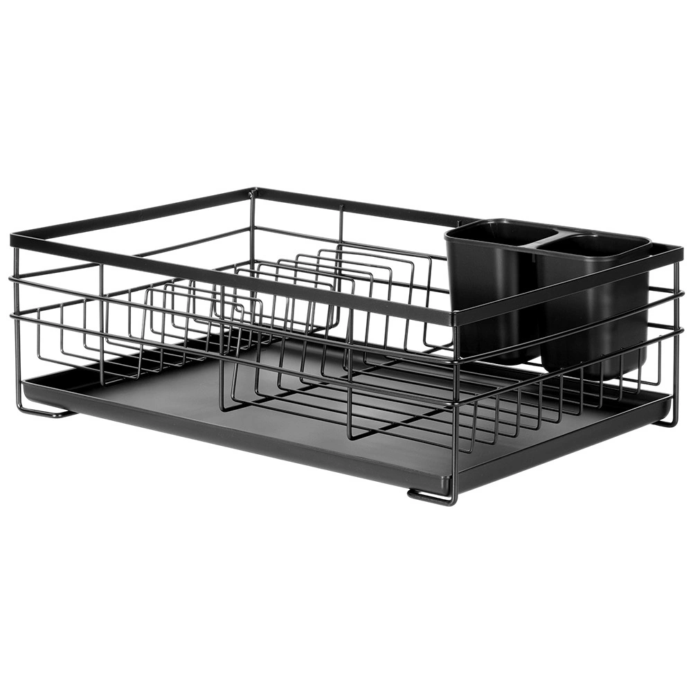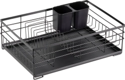 A practical and stylish black dish rack for neatly drying plates, glasses, and cutlery. It offers a large capacity, a durable metal frame, and a removable drip tray that protects your countertop from water.