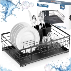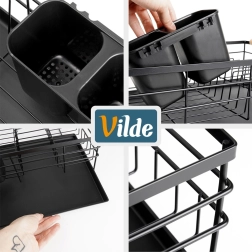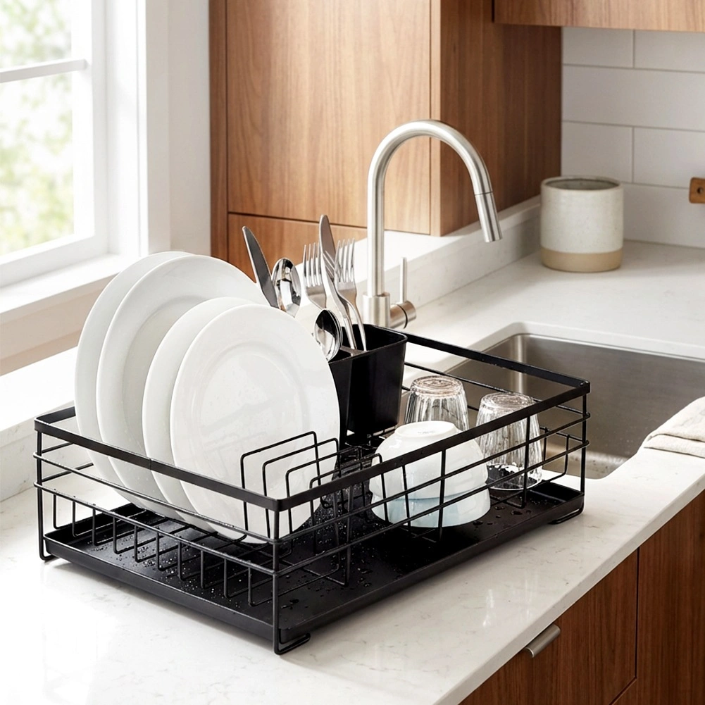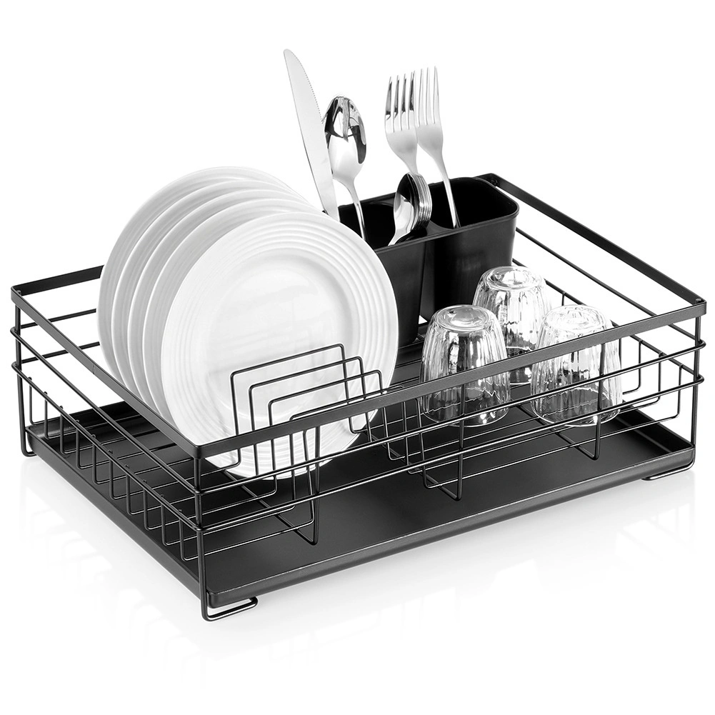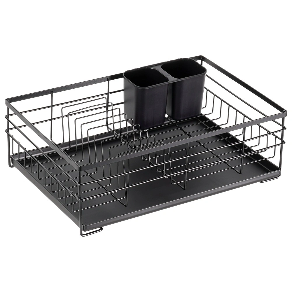A practical and stylish black dish rack for neatly drying plates, glasses, and cutlery. It offers a large capacity, a durable metal frame, and a removable drip tray that protects your countertop from water.