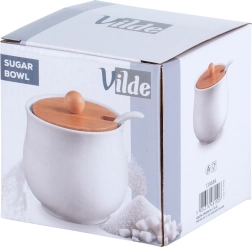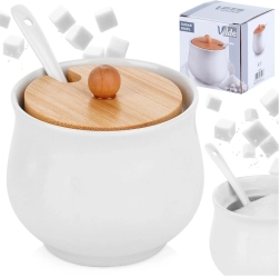 An elegant white sugar bowl with a bamboo lid and ceramic spoon, ideal for everyday serving. It offers a 250 ml capacity, a removable lid with a cutout for the spoon, and a durable ceramic build that keeps contents fresh and clean for longer.