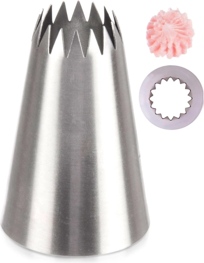 Practical pastry decorating tip with an open star for easy, eye‑catching decoration of cakes, pies, and cupcakes. Made of stainless steel, it is durable, food-safe, and dishwasher-safe. Compatible with all piping bags and effortlessly creates beautiful rosettes, stars, and waves.