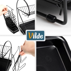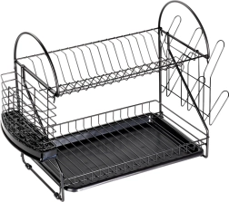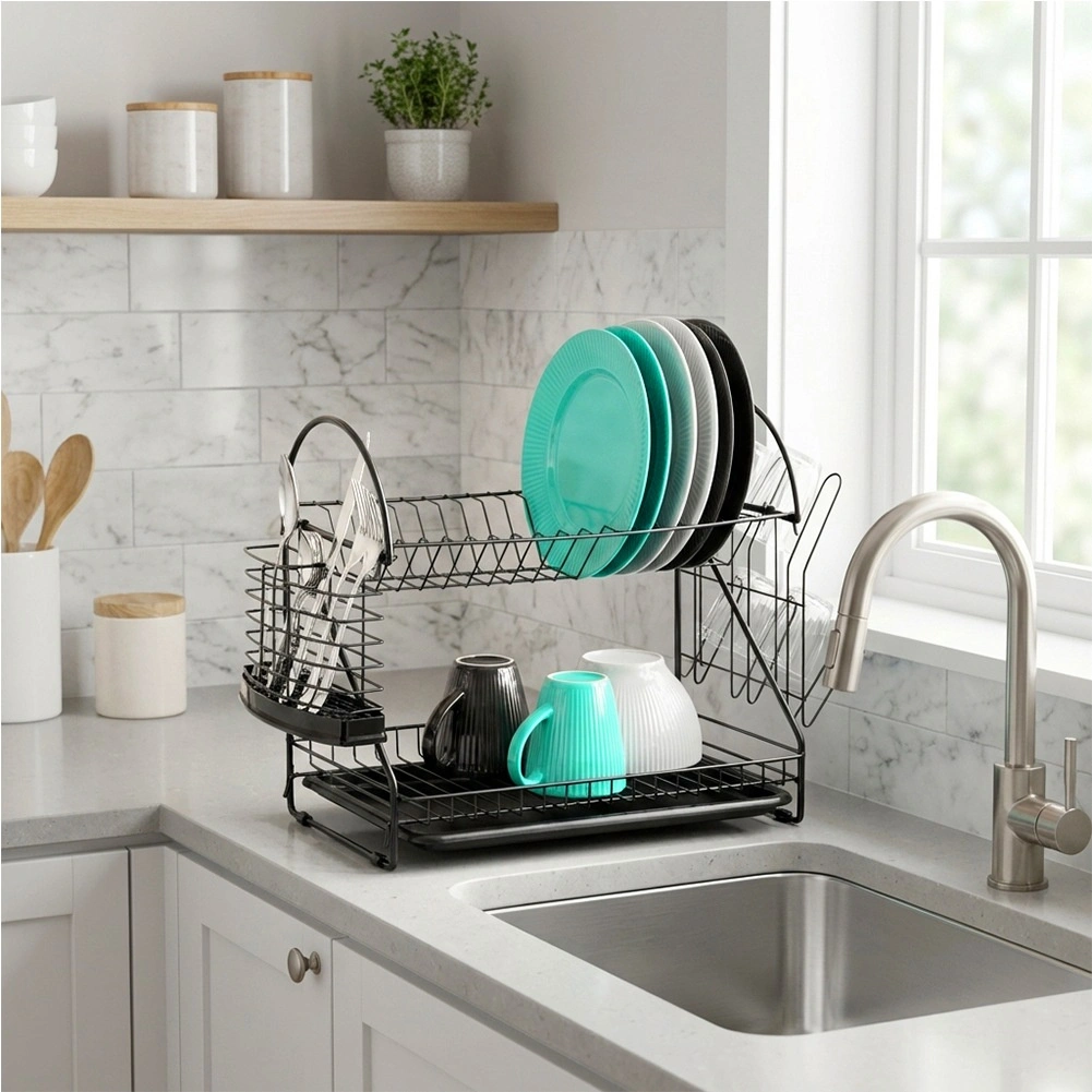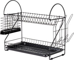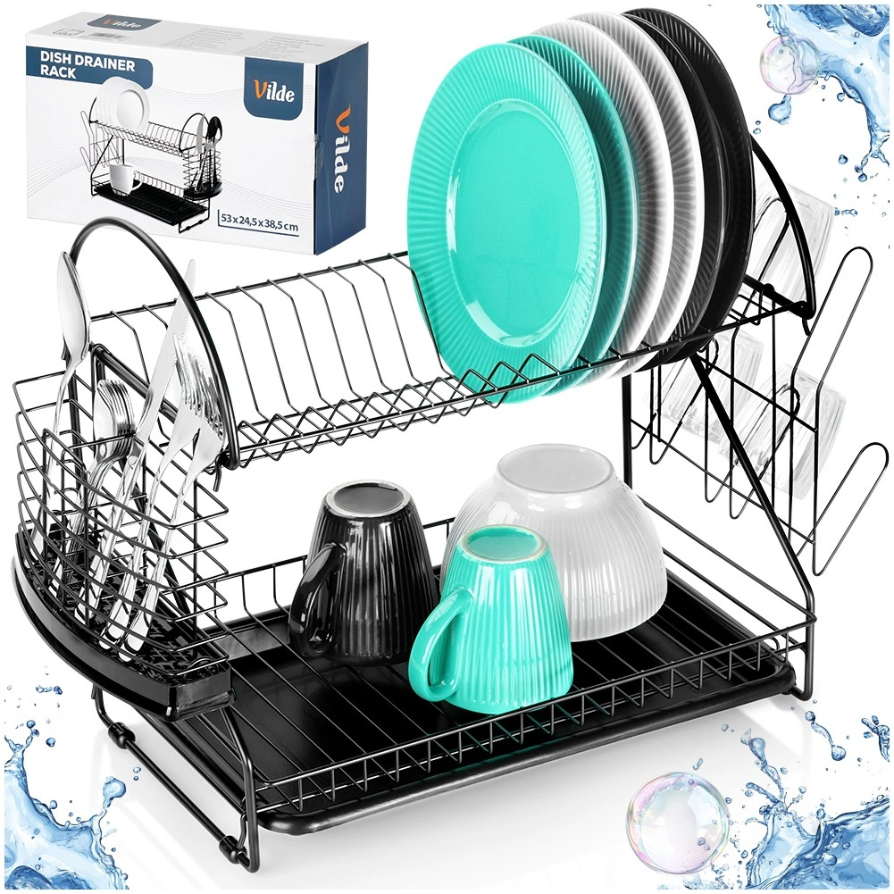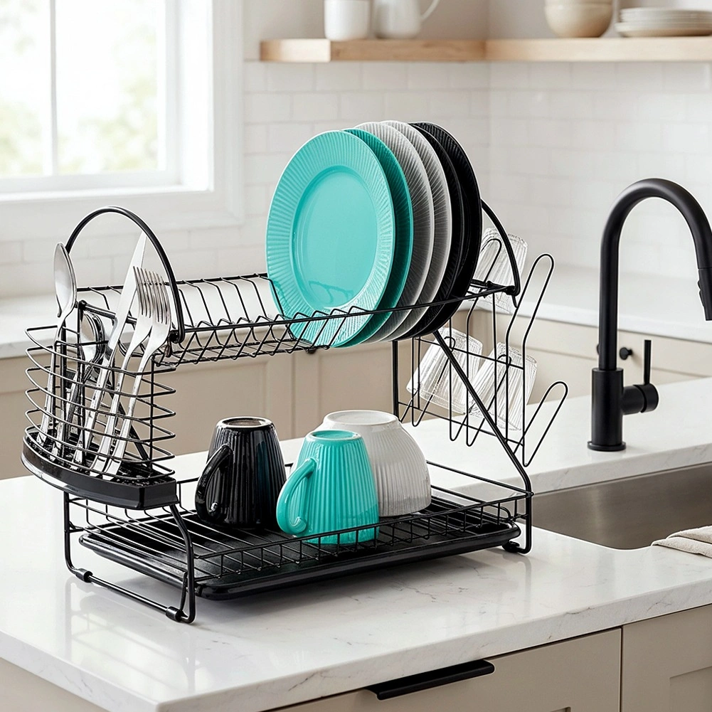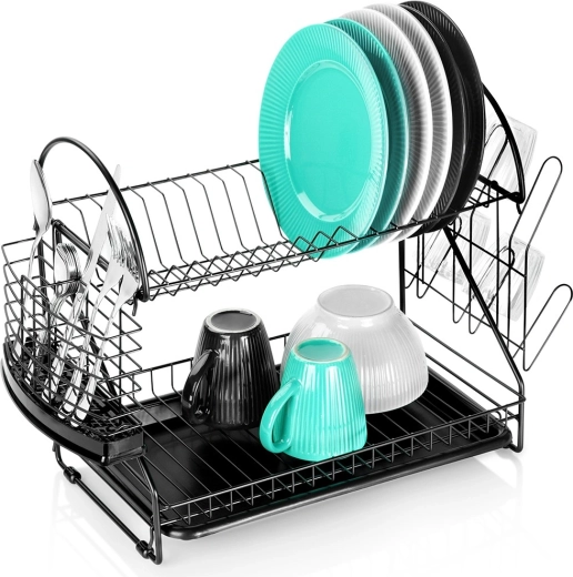 A practical two-tier dish rack in elegant black that makes daily washing and drying easier. It offers an upper rack for plates, a lower surface for bowls and glasses, a removable cutlery basket and a side holder for cutting boards. Thanks to its large capacity and drip tray, it keeps your kitchen clean and organized.