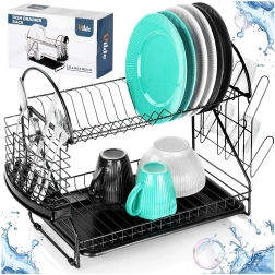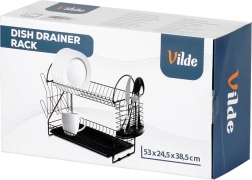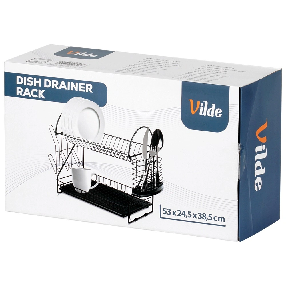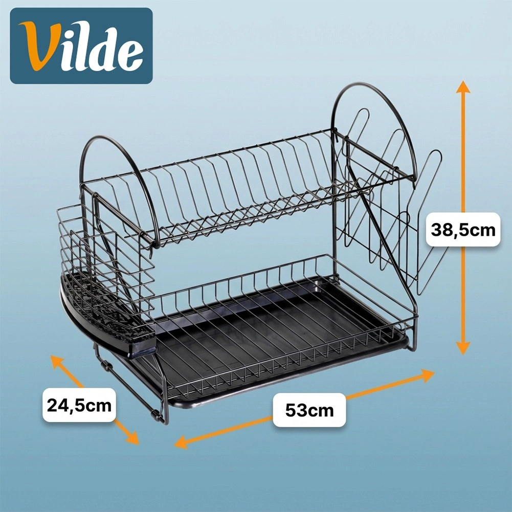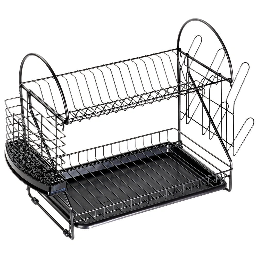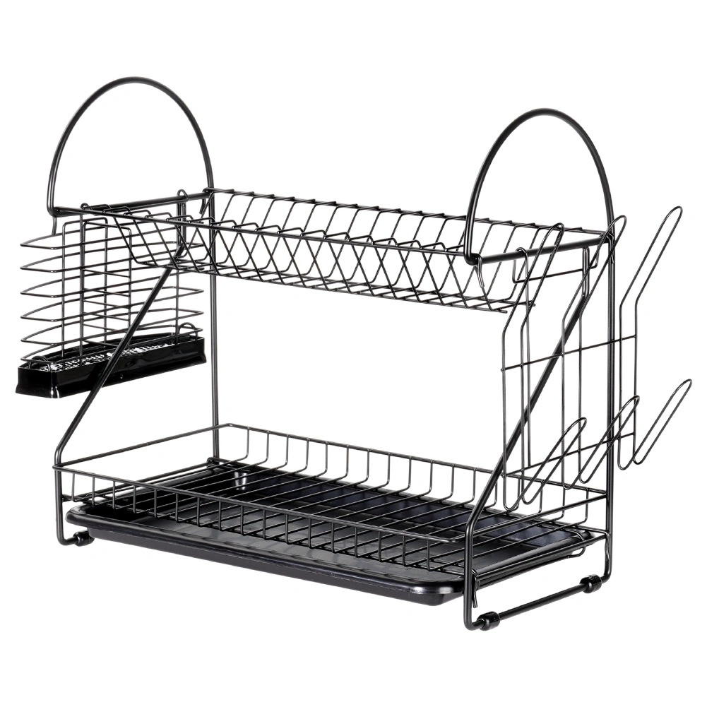 A practical two-tier dish rack in elegant black that makes daily washing and drying easier. It offers an upper rack for plates, a lower surface for bowls and glasses, a removable cutlery basket and a side holder for cutting boards. Thanks to its large capacity and drip tray, it keeps your kitchen clean and organized.