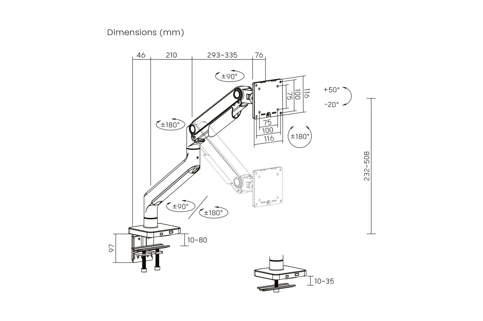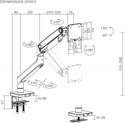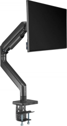 A professional desktop mount for large monitors up to 49" and 20 kg offering maximum stability, full flexibility, and ergonomic adjustment with ease thanks to the mechanical spring. Supports flat and curved displays, features a quick-release VESA, two mounting options (clamp and grommet), cable management, and a 180° rotation stop for safe use in the office and at home.