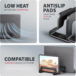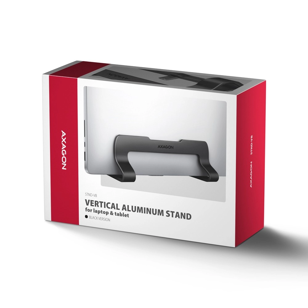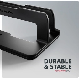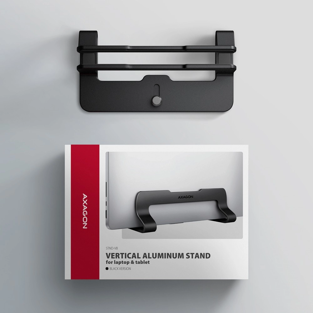 Keep your desk tidy and spacious. The vertical stand AXAGON STND-VB securely holds your laptop above the work surface, promoting better airflow around the fans, reducing dust buildup, and protecting the device from accidental spills. Its compact dimensions and elegant black design suit the office, home workspace, and travel.