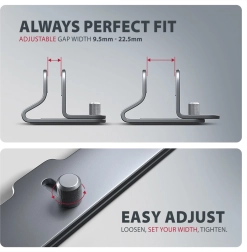 The elegant and practical AXAGON STND-VG stand holds your laptop or tablet in a vertical position, saves desk space, and supports better cooling. Thanks to the adjustable width of 9.5–25.5 mm, it fits most devices with a screen size of 10–17.3". The sturdy aluminum construction with a non-slip surface protects your device from scratches and unwanted movement.