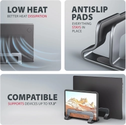 Placing the laptop upright improves airflow around the fans, which helps with efficient heat dissipation, stable performance, and longer device lifespan. It also keeps the keyboard clean and protects the laptop from dust or accidental spills, as it sits above the work surface. The compact dimensions and elegant gray finish suit a home office, business, or travel.