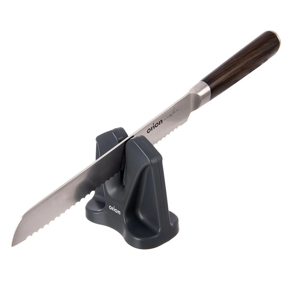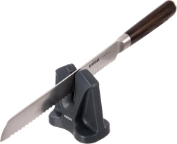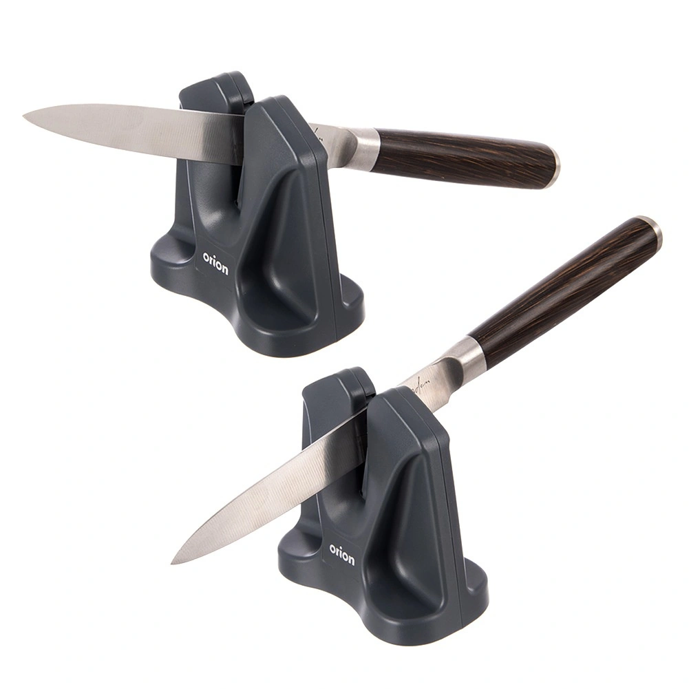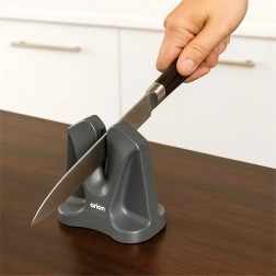 Compact manual 2-in-1 knife sharpener for quick and safe maintenance of kitchen knives and scissors. With two sharpening stages, it provides coarse edge restoration and fine honing and edge alignment. The design with an automatically set angle makes it easy to guide the blade correctly without experience. A stable base with non-slip silicone pads ensures confidence during use.