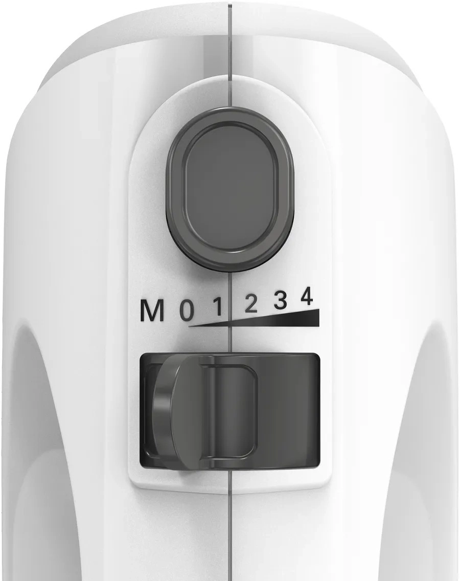 The lightweight and powerful BOSCH CleverMixx hand mixer with a 400 W motor handles gentle whisking, mixing, and dough kneading. It offers 4 speeds plus turbo for maximum control, high-quality stainless-steel beaters and dough hooks, and a handy attachment release button – an ideal helper for everyday baking.
