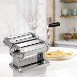 Homemade pasta made easy. The manual pasta machine MAESTRO MR-1679 is made of high-quality stainless steel for long-lasting durability and stability. With 9-step adjustment, you can set dough thickness from 0.3 to 3 mm and prepare perfectly even sheets for lasagna and noodles exactly to your taste.