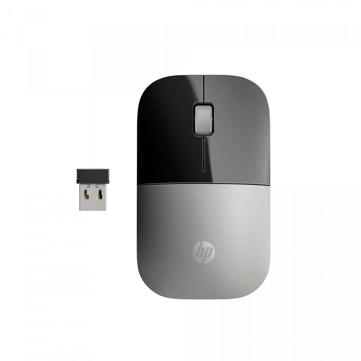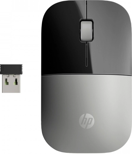 The HP Z3700 wireless mouse stands out with a minimalist, low-profile shape that complements both laptops and desktops. The two-tone finish with a silver surface and HP logo underscores its modern look, while the symmetrical design is comfortable for both left- and right-handed use.