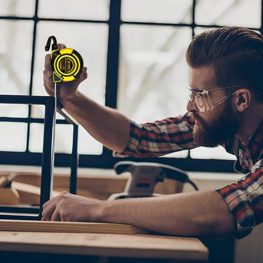 Thanks to the practical lock, you can keep the blade in the chosen position without unwanted rewinding; the end hook anchors firmly to edges and improves measurement accuracy. A metal belt clip for fastening and a wrist strap for easy carrying are included.