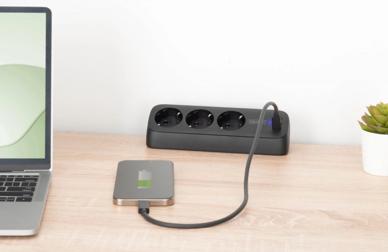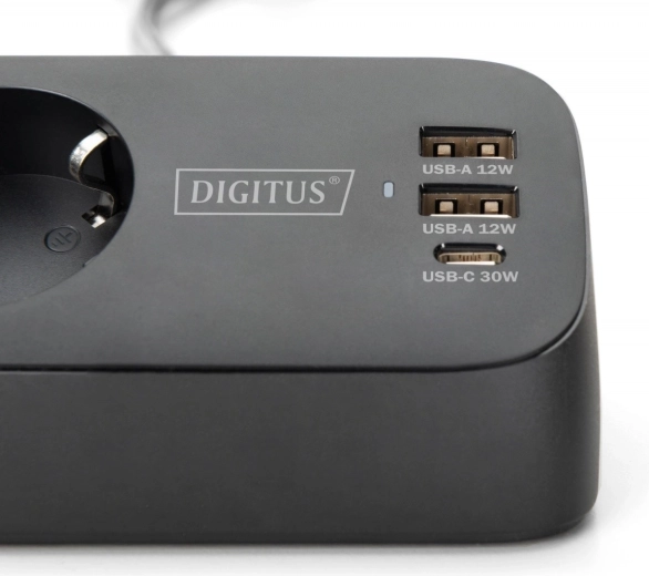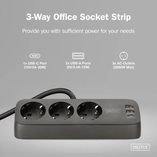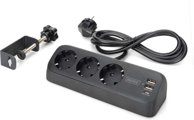 A practical desktop extension strip with 3 Schuko sockets and integrated charging via USB-A (2×12 W) and USB-C (30 W) for fast power to your phone, tablet, and accessories. Thanks to the desk clamp mount, you can install it easily and without drilling exactly where you need it. Includes short-circuit, overheat, and surge protection for safe operation in a home office or workplace.