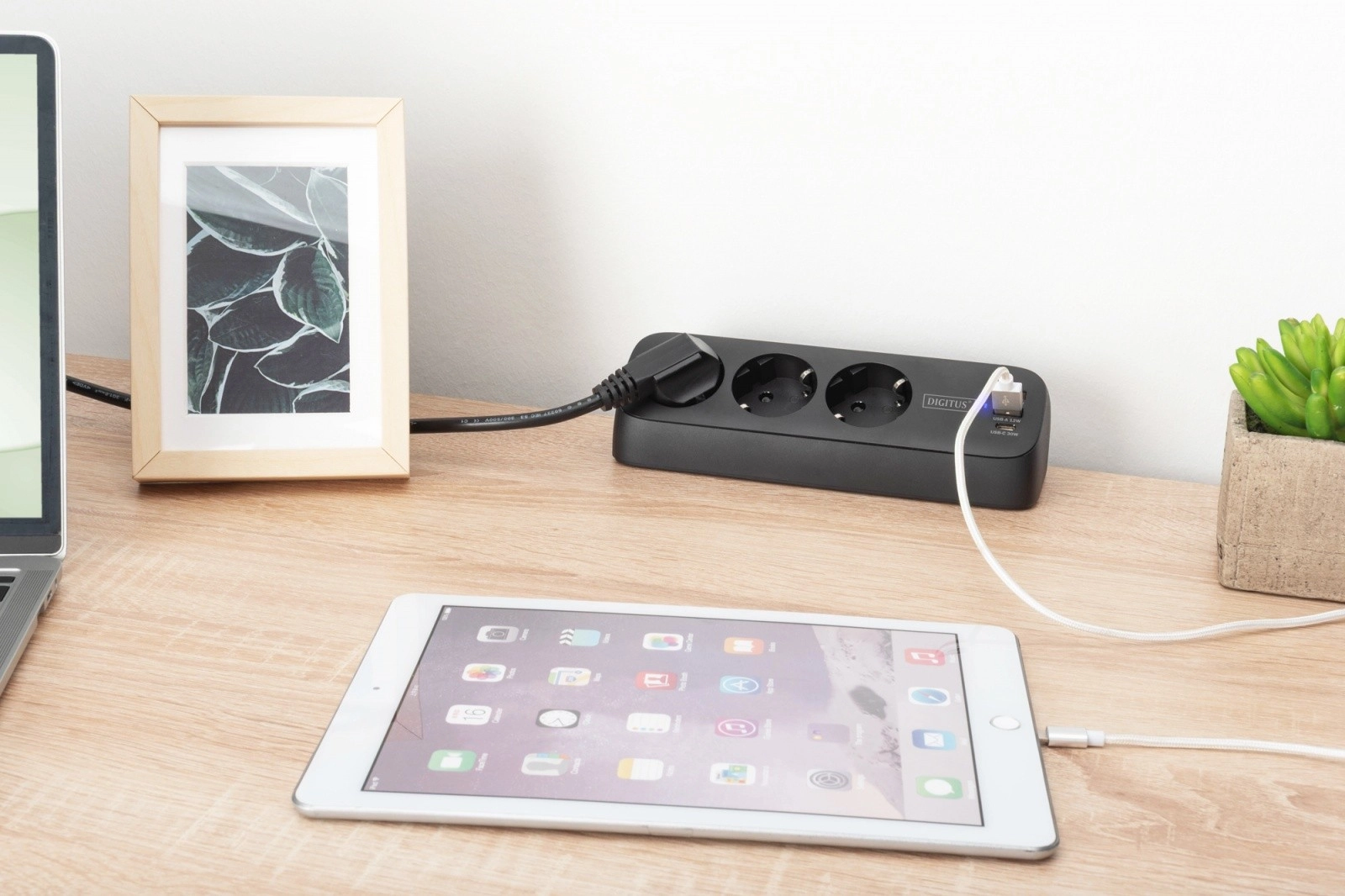 Keep your desk tidy and power all your devices from one place. The desktop strip offers three Schuko sockets at a 45° angle for convenient adapter placement, plus fast USB charging — two USB‑A ports (up to 12 W each) and one USB‑C port delivering 30 W for phones and tablets.
