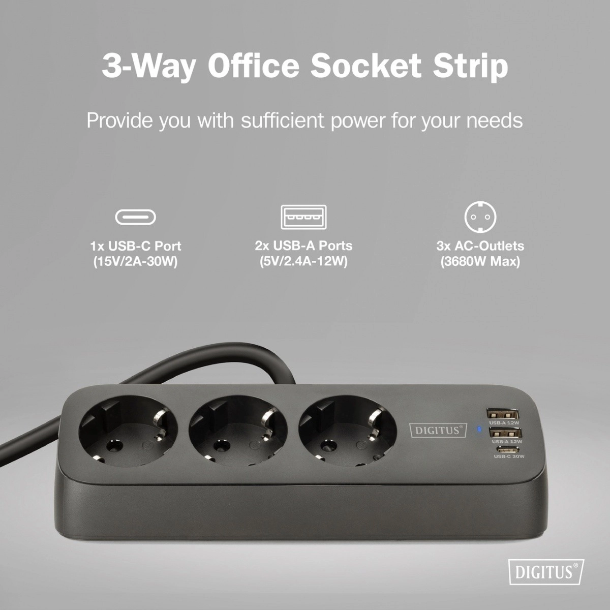 • 3× Schuko sockets spaced at 45° for comfortable plugging