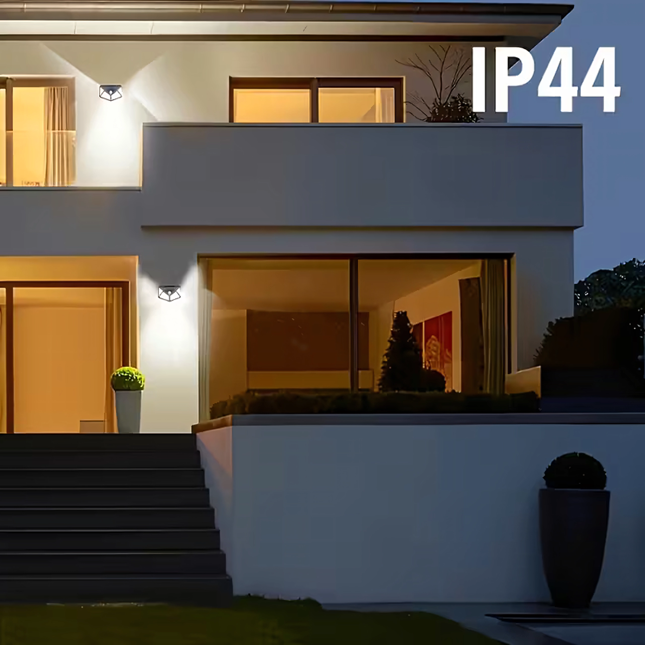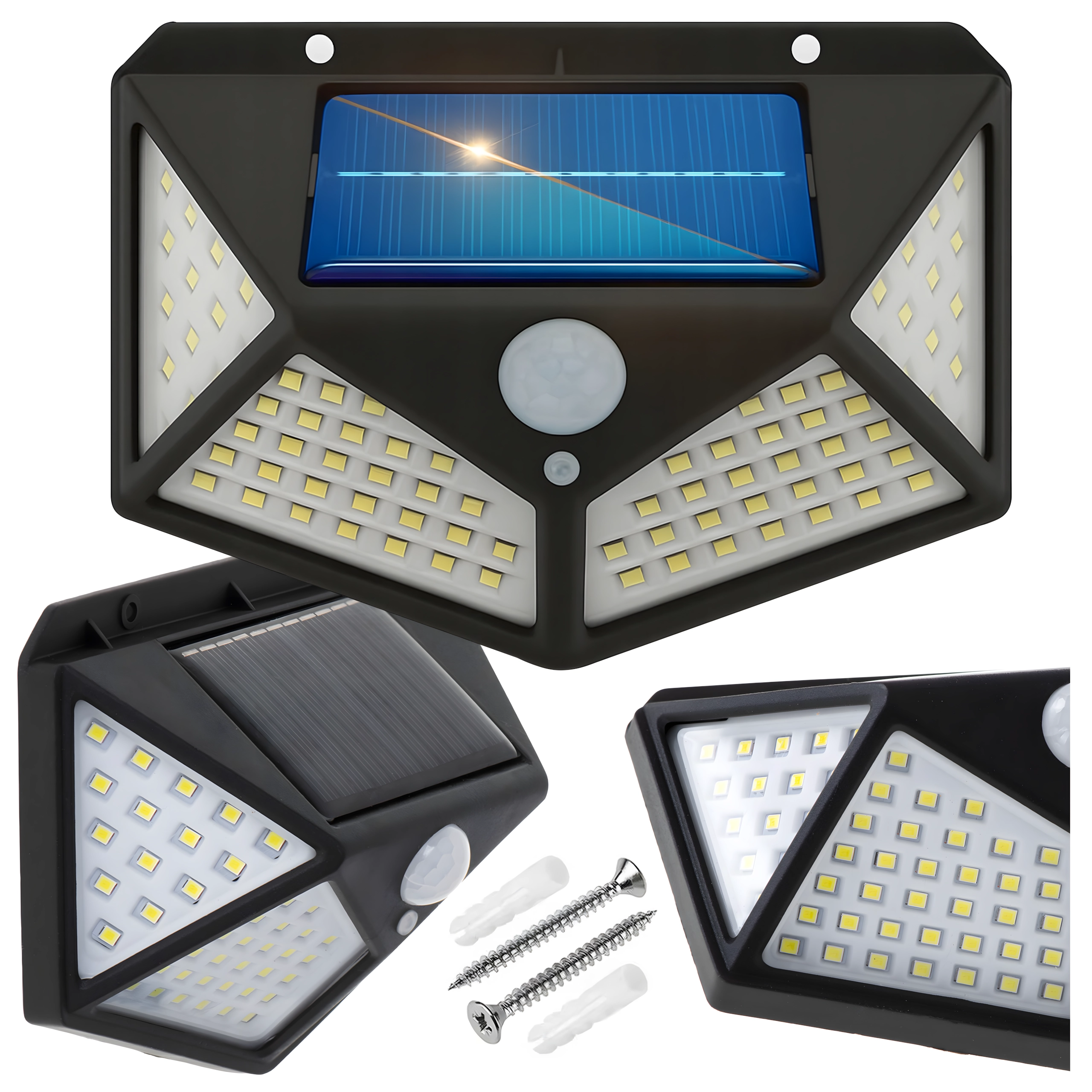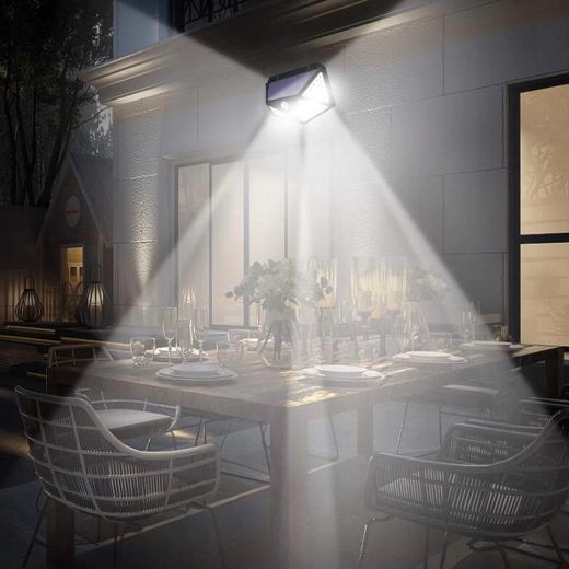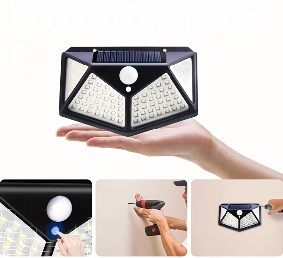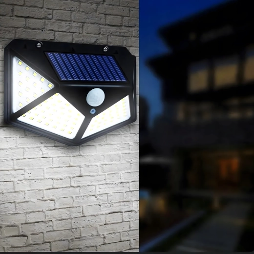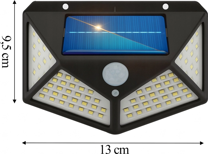 Practical outdoor solar light with 100 LEDs for wide-angle illumination of walkways, entrances, and gardens. Thanks to the dusk and PIR sensors, it automatically turns on at dusk and when motion is detected, it’s wire-free, weather-resistant, and easy to mount on the wall.