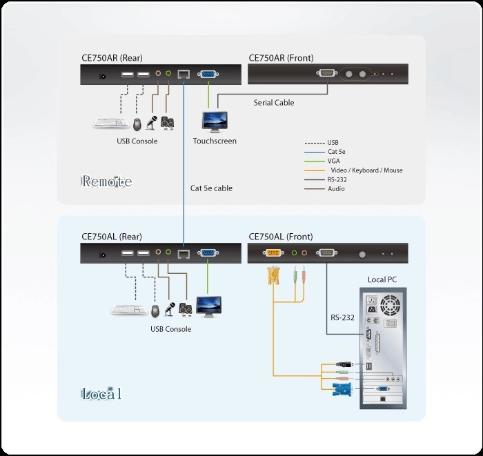 The integrated RS-232 port on both the local and remote units enables serial configuration and device connectivity such as touchscreens and barcode scanners. This solution is ideal for industrial areas, production halls, or construction sites where you need the console at hand and the computer in a protected backend.