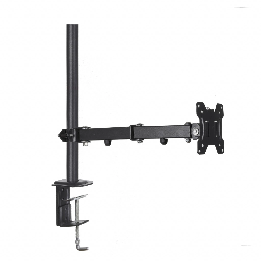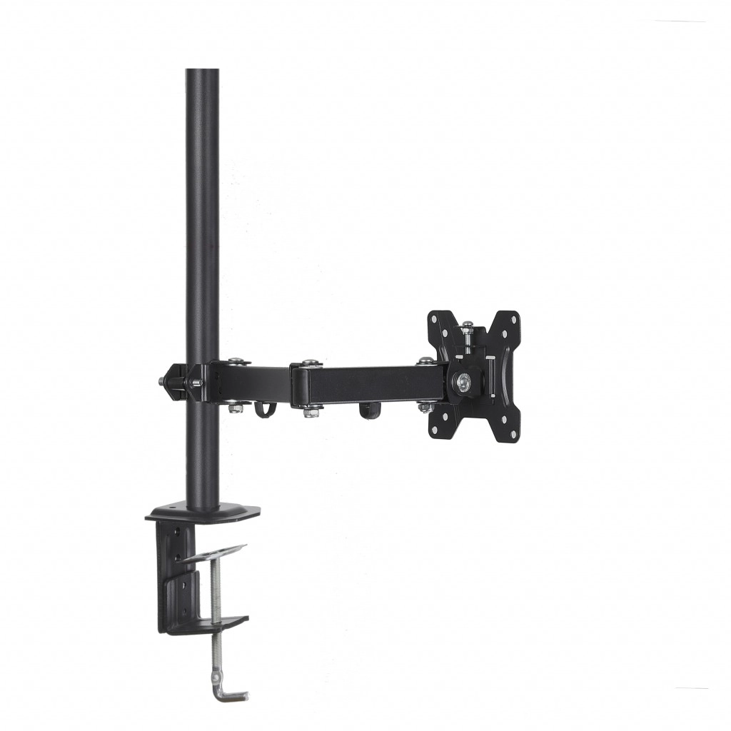 A universal desk mount for a single monitor with a diagonal of 13–32" and a load capacity of up to 8 kg saves desk space and improves ergonomics. It offers a wide range of adjustments thanks to three joints, vertical and horizontal tilt, PIVOT (portrait) function, and concealed cable management. Secure mounting is ensured by a C-clamp or grommet to the desktop.